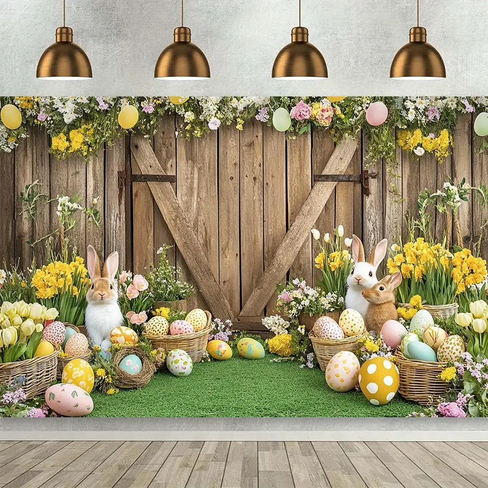 1pc Spring Easter Backdrop with Rabbit, Colorful Eggs, Fence Wall Decor for Photoshoot and Party Supplies, Cake Table Photo Booth Props, Banner Decor - Use Without Electricity, Polyester, General