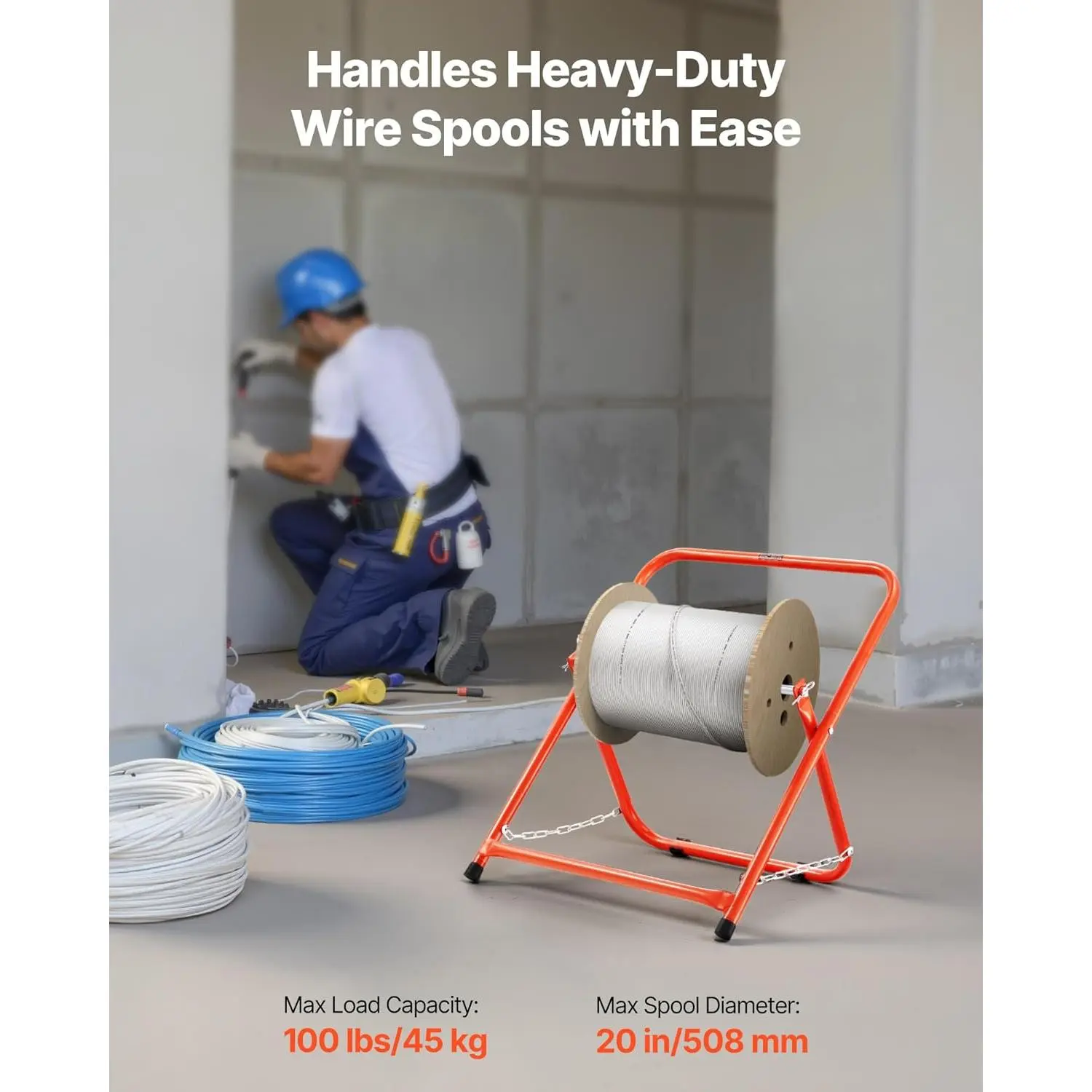 Built Tough for Big Tasks: Constructed from high-strength metal with a 100 lbs load capacity, this wire spool rack features rock-solid durability and rust resistance, an ideal for electricians, contractors, and industrial sites