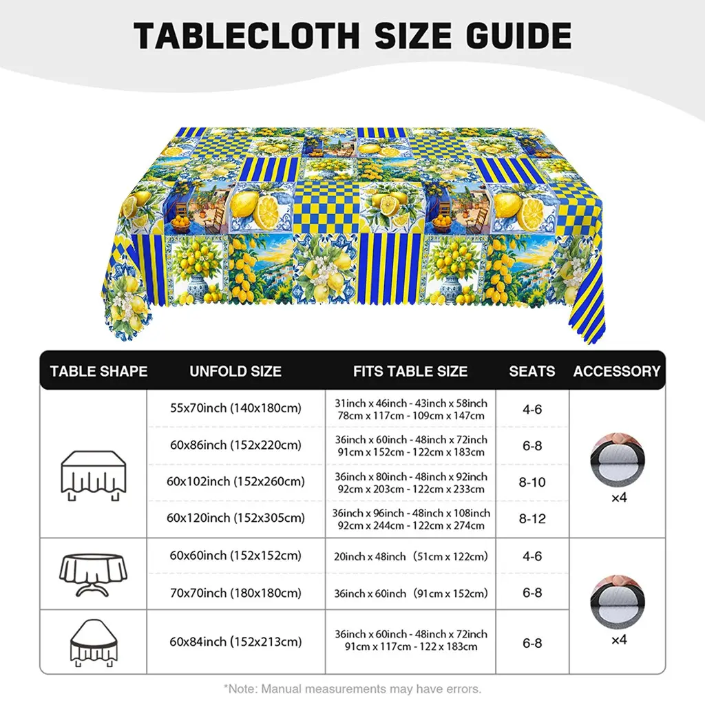 🍋 Easy Care:Machine washable in cold water. Tumble dry low heat or air dry; Warm ironing if needed. No bleaching. Our tablecloth is spillproof, fade resistant, stain resistant and wrinkle free.