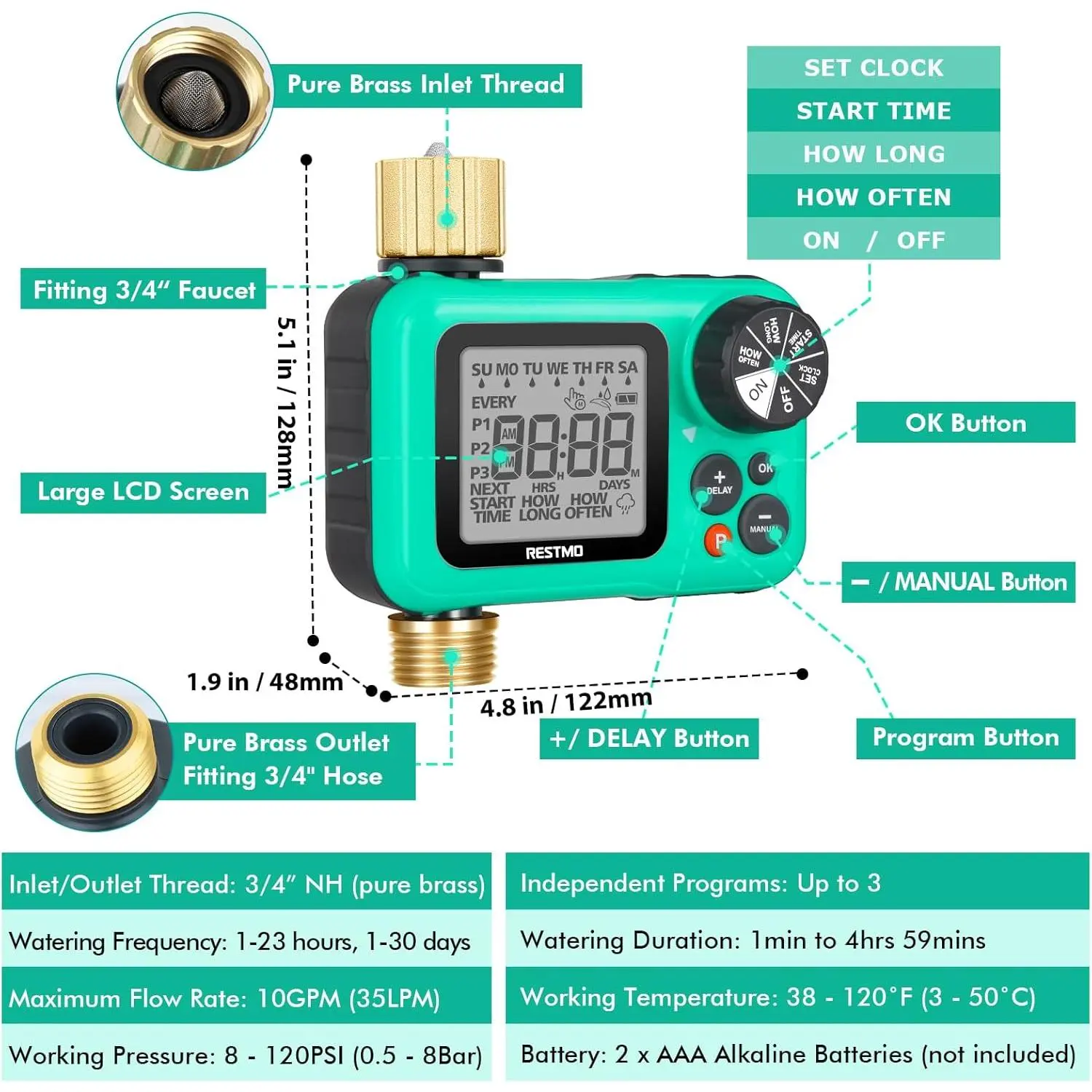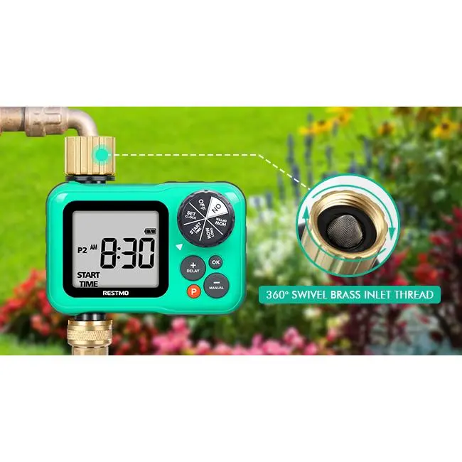 [Easy To Use]Rotate the oversized dial to set clock, start time, how long and how often for all the 3 programs.Rotate it to "ON" and your programs automatically run.Long press manual button can manually and manual not interrupt preset programs.Long press delay button can delay the program and save in rainy days.The large LCD display (2.5") is easy to read.