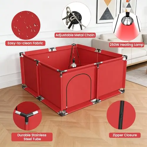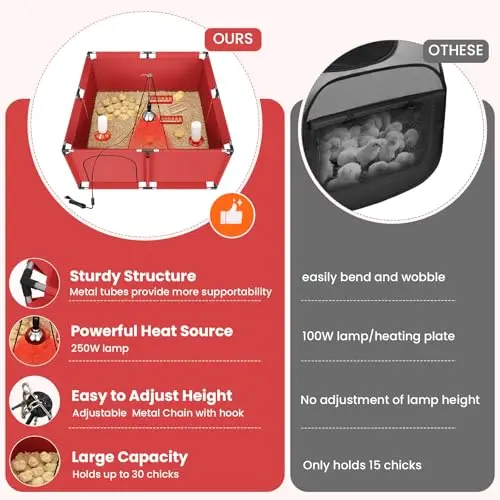 ·【Warmth & Protection】: Equipped with 250W heating lamp, the height-adjustable lamp stand allows flexible heating distance adjustment based on growth stage and ambient temperature, provide safe warmth environment for chicks