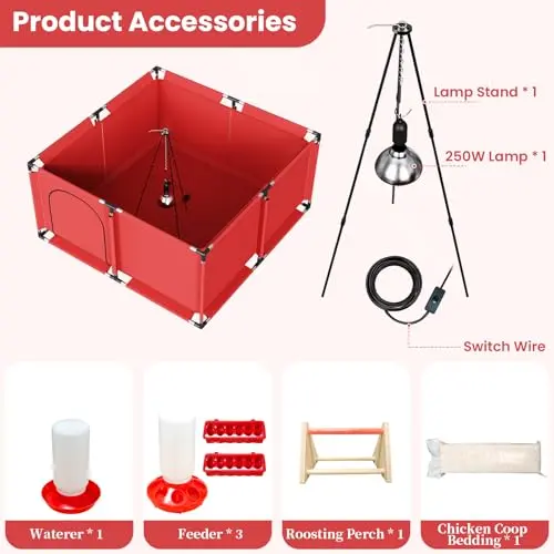 ·【All-in-One Starter Kit】: Brooder pen *1, 250W heating lamp*1, lamp stand*1, chicken feeder & waterer set*1, perch*1, chicken bedding*1. All supplies for living are fully equipped. You can set up a complete brooding environment for chicks.