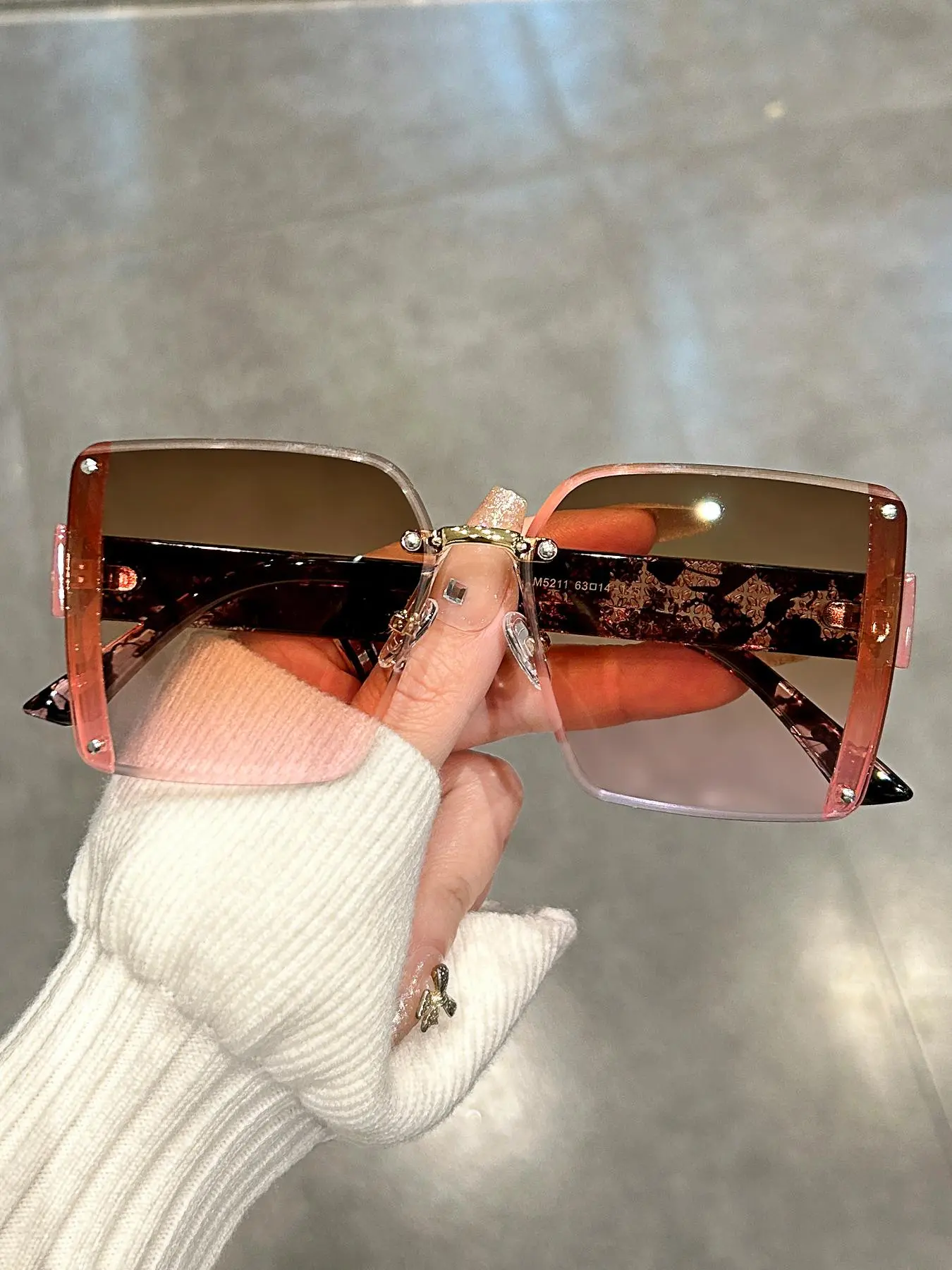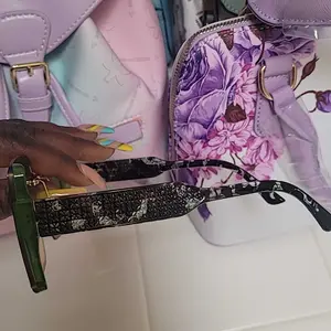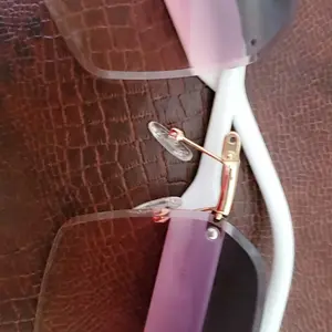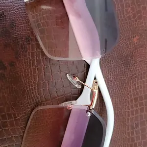 Theses sunglasses are just like the photos show them. They are a pretty pink color. With designs on the ear pieces. They are lightweight. Easy to open and close. Have nice nose pieces that are comfortable. A nice clean finish around the edges.