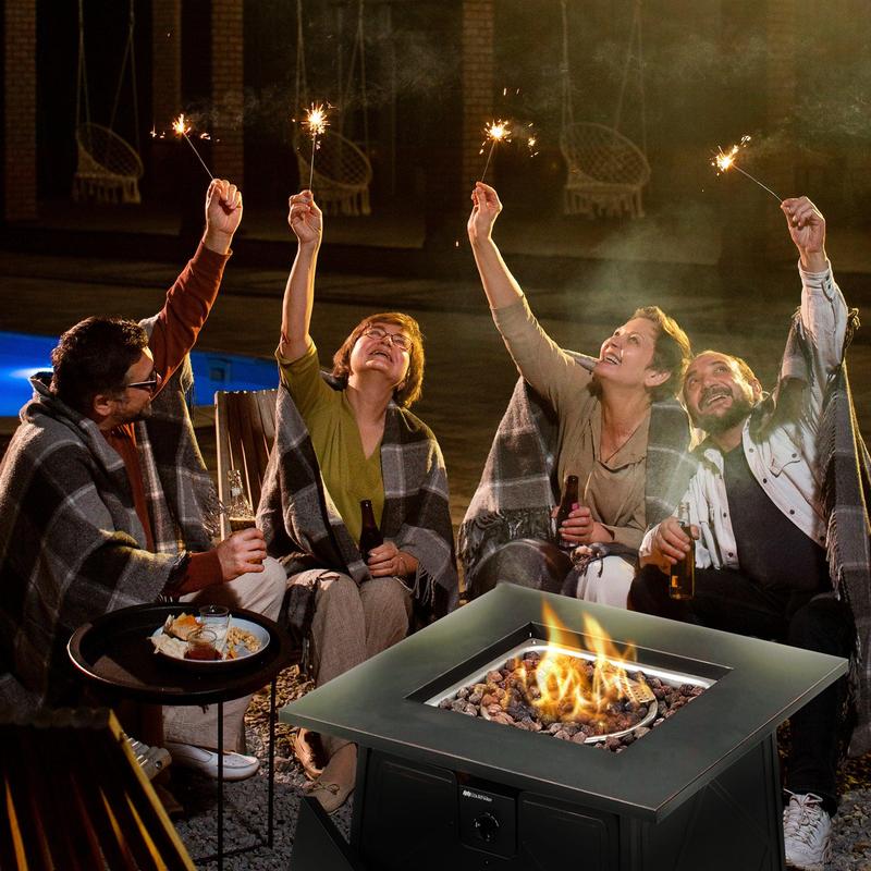 ·Steel 28-inch square gas fire pit is ideal for gathering around a toasty fire and lingering outdoors throughout the seasons