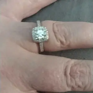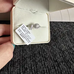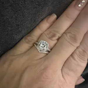 Beautiful halo ring. Tested for real diamonds on my diamond detector. Came in a box with a ring case, free ring, and Moissanite card. Arrived in 12 calendar days. Overall, a great experience. I will be purchasing more! Pics with my 1.5 ct diamond necklace. Just as shiny and beautiful as a real 💎