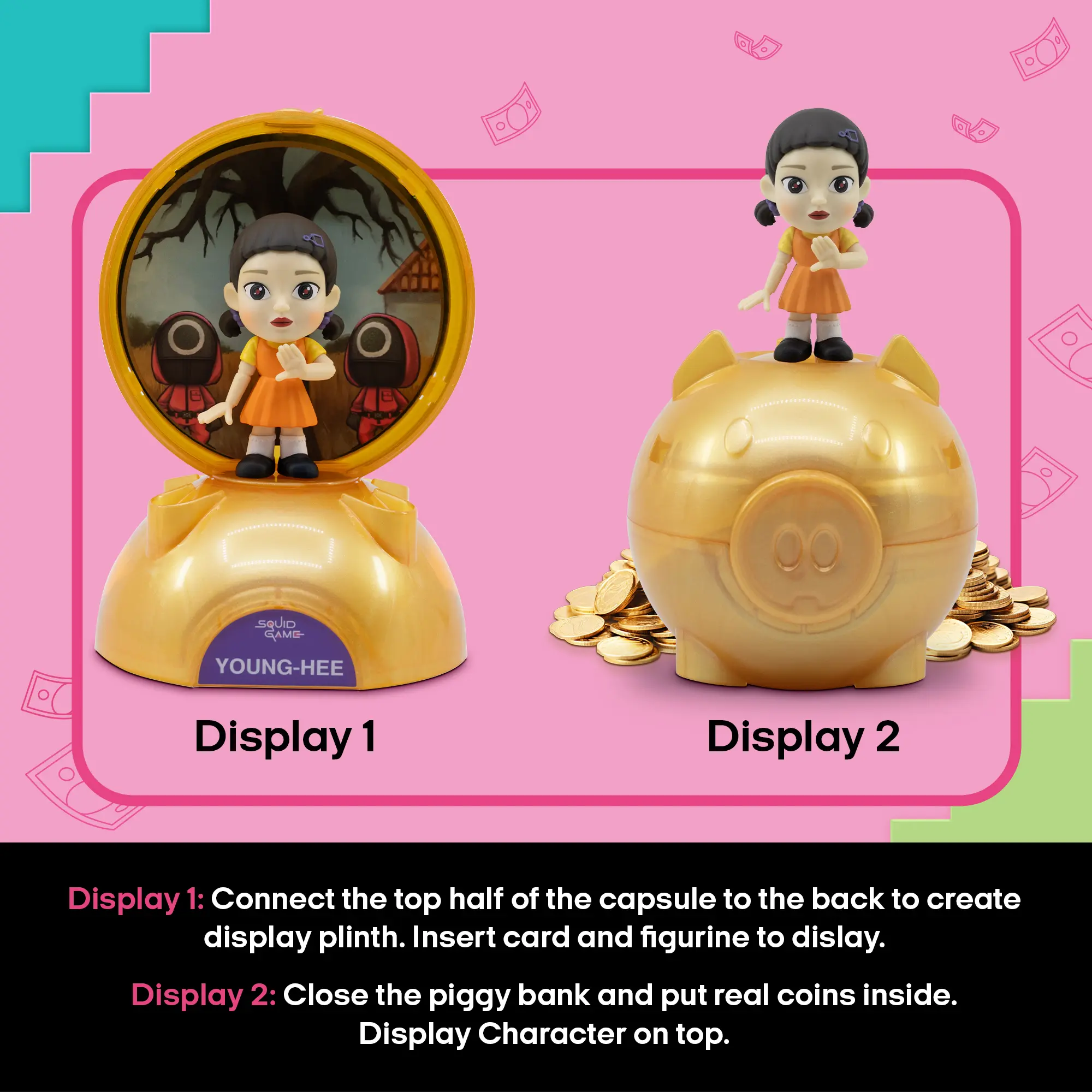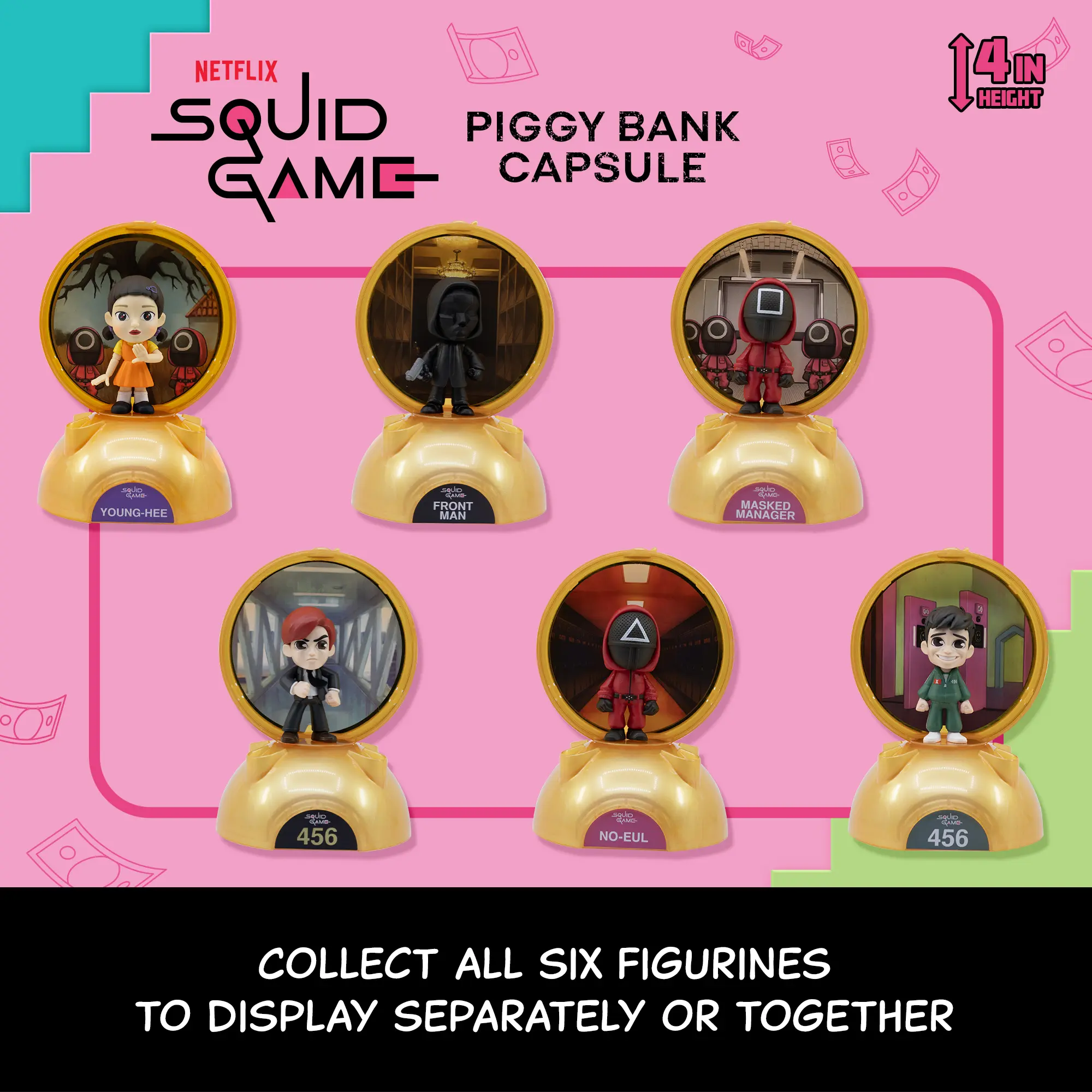 DISPLAY 2 WAYS - These iconic figures have 2 ways to be displayed and shown off, whether you want your figure to stand victory on top of the piggy bank or stand in front of a classic Squid Games background card of your choice.