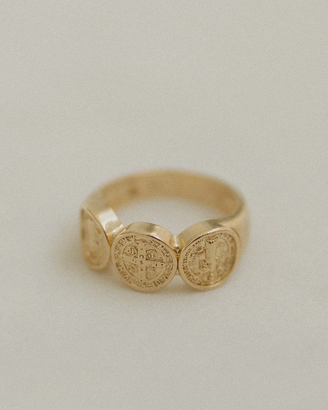 I couldn’t love this ring more. It’s a beautiful Benedictine medal design, and it feels both meaningful and elegant at the same time. The gold has a warm, classic tone, and the three Saint Benedict medallions give it a strong, timeless presence without feeling bulky or overstated. What I appreciate most is that it isn’t just jewelry, it’s sacramental. Wearing the Saint Benedict medal daily feels grounding and protective, like a quiet reminder of my faith, prayer, and spiritual strength throughout the day at a therapist. It’s comforting to carry that symbolism with me wherever I go. The craftsmanship is excellent. The band is smooth and comfortable, the engraving is crisp, and it has a nice weight that makes it feel substantial (not overwhelming) and well-made. It works just as well dressed up as it does for everyday wear. I just wish there were half sizes.