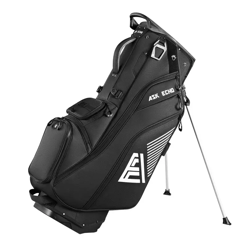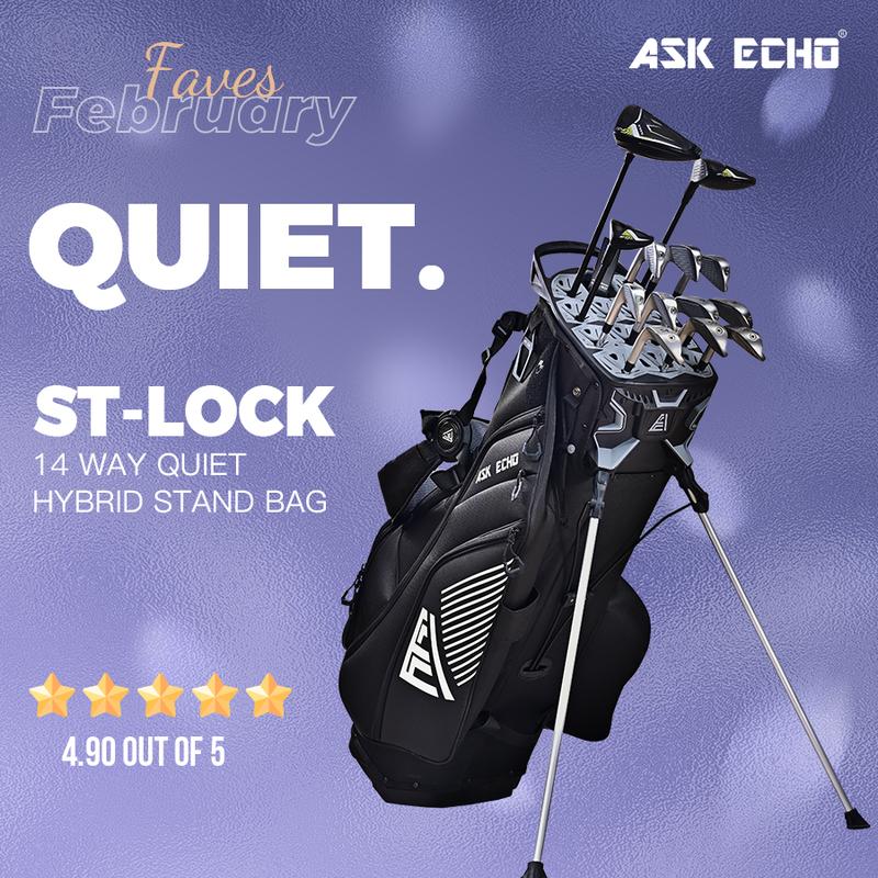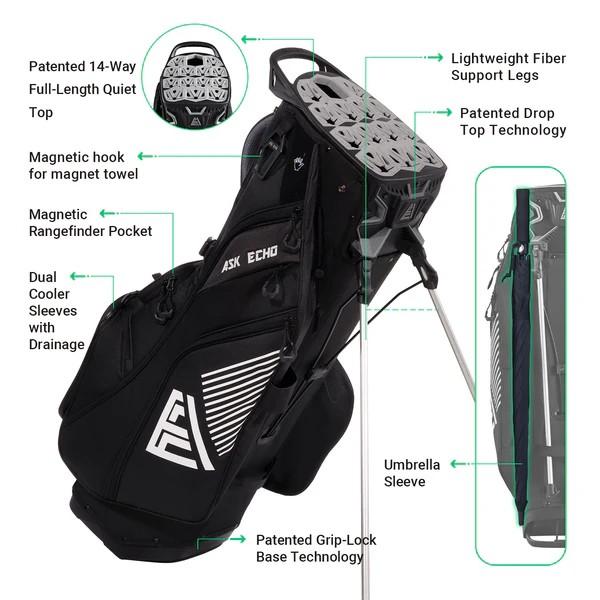 ·The ST-LOCK golf stand bag features ASK ECHO GOLF's patented Mecha-style design. Its dual-system organizer top frame and grip locking base, paired with full-length dividers, well prevent clubs chatter, reducing wear and extending club lifespan.