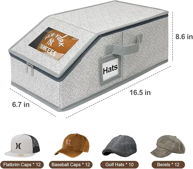 Holds up to 24 hats. Each box measures 16.5" × 8.6" × 6.7" (approx. 40.9 × 21.1 × 16.9 cm). Provides ample space to store baseball caps without bending or damaging them. Perfect for wardrobes. Made of non-woven fabric and thick cardboard. Offers great ventilation and long-lasting sturdy support. Ideal for household storage.