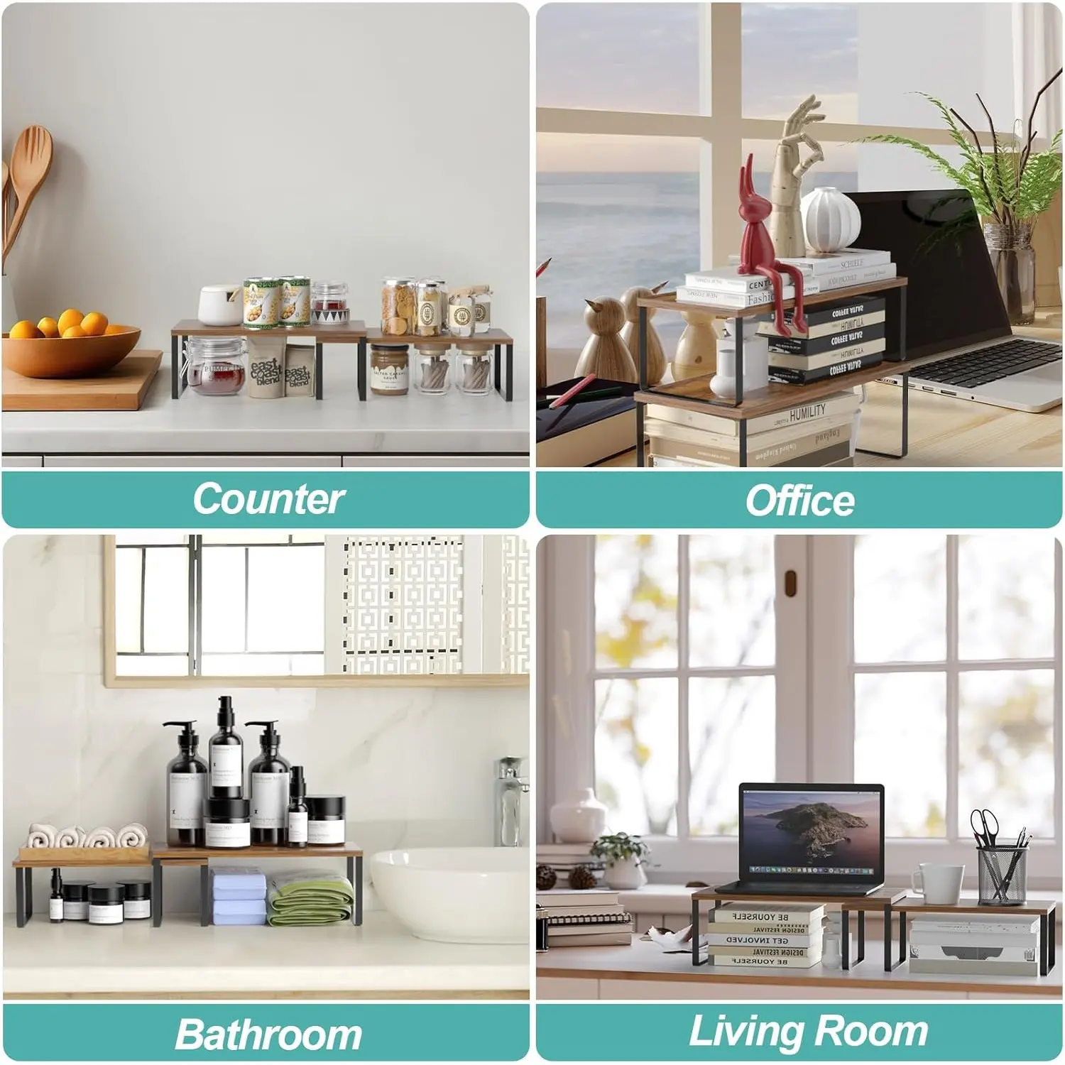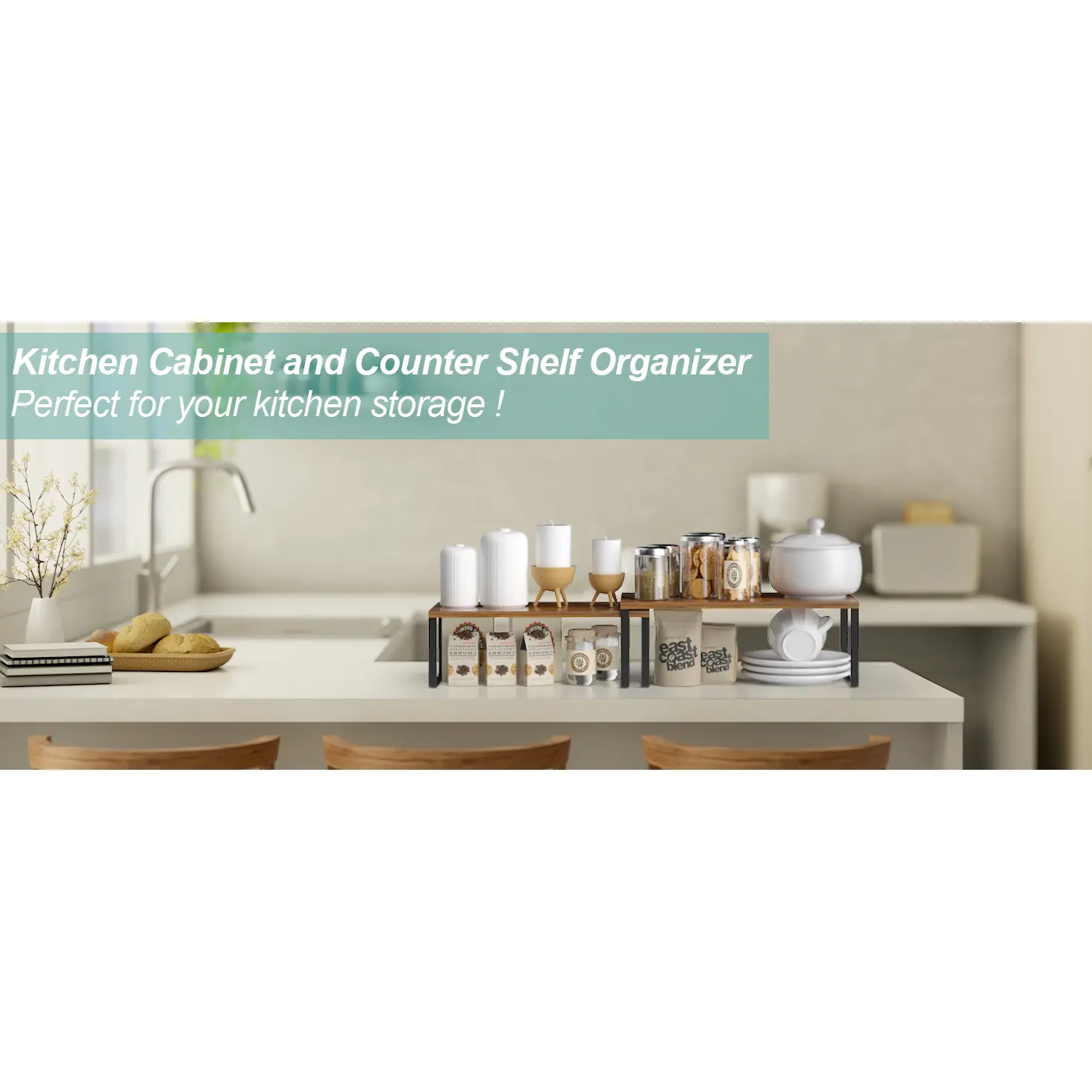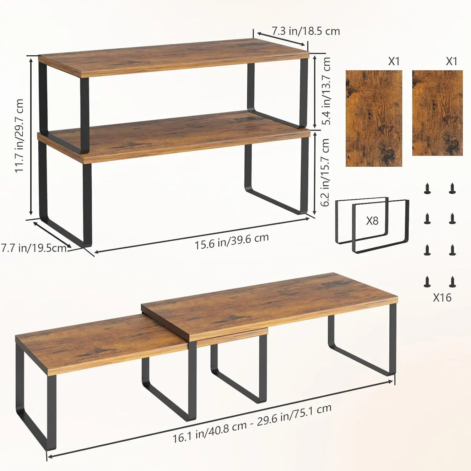 2-Pack Stackable Cabinet Shelf Organizer | Expandable Kitchen Pantry Spice Rack for Counter,Cupboard Storage | Black/Brown