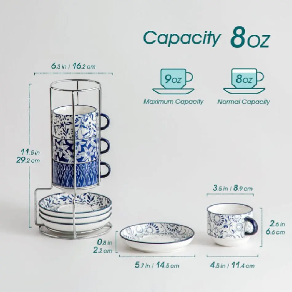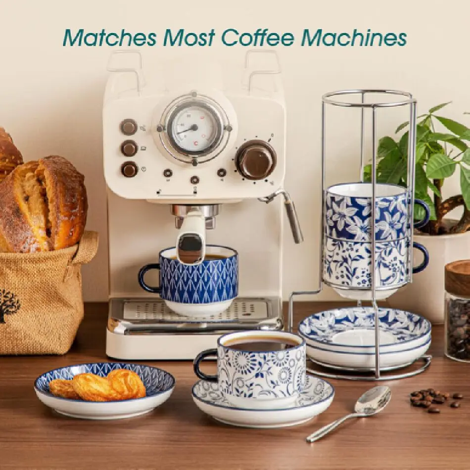 【Complete Coffee Cups Set For Gathering】 espresso cups set includes 4 exquisite cups, 4 matching saucers, and a silver metal stand. With 2.5oz for espresso, 4oz for macchiatos, and 8oz for lattes, it's perfect for your quiet "me-time" or joyful gatherings
