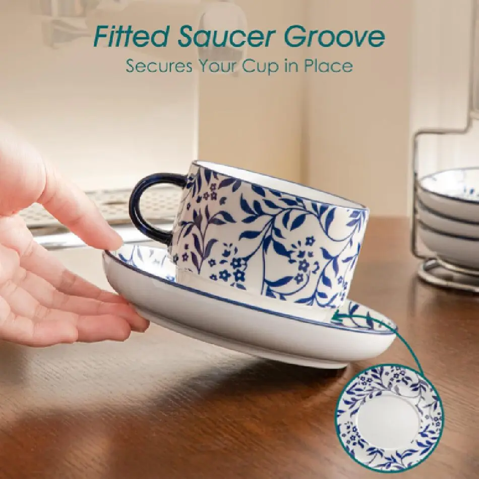 【Secure-Fit Saucer with Anti-Slip Groove】Reduce cup wobble and minimize spills. Our saucers feature a precision-designed groove that snugly cradles the cup base. Allow you to sip with confidence during lively chats, focused work, or while moving around