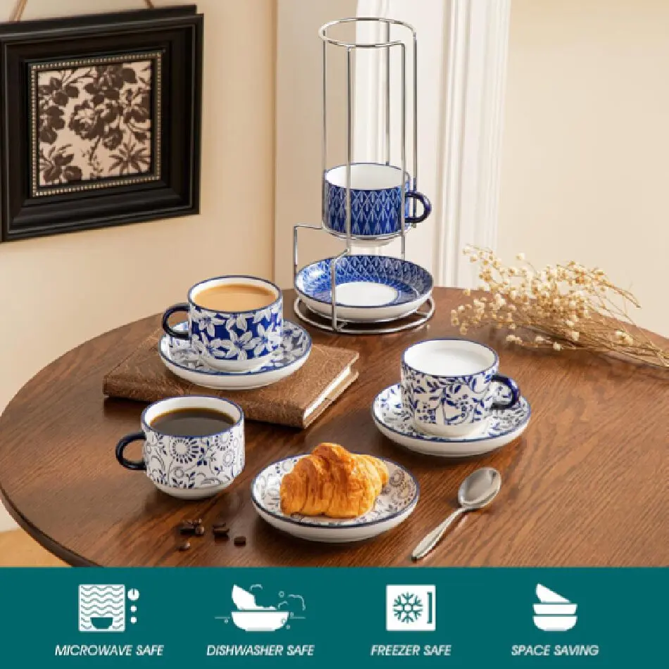 【Space-Saving Stackable Mugs】Effortlessly maximize your storage space! metal stand allows for vertical cup stacking, reducing storage footprint by over half. It's an ideal storage solution for cozy kitchens, dorms, or RVs. Keep your beautiful set organized, secure, and ready to use