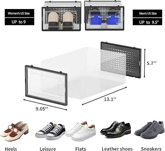 Each bin measures approximately 13.4” × 9.5” × 5.7”, making them suitable for medium-sized shoes up to men’s size 8. Their compact yet spacious design fits seamlessly into any storage area.