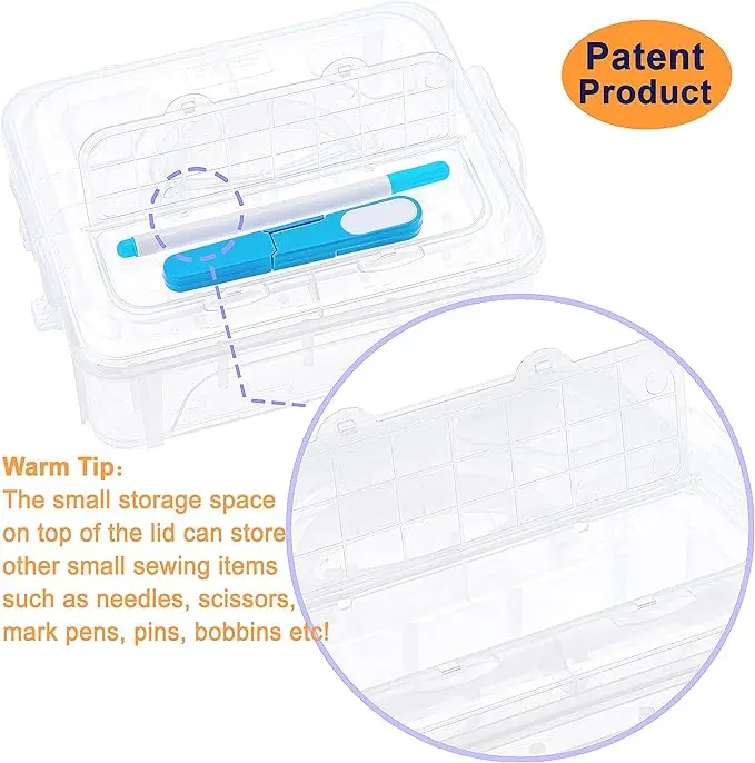 ·Stackable & Lockable Each Layer: Each layer can be stacked and locked with each other firmly. There are 20 plastic pins in each layer to hold each spool upwards, which can prevent the thread spools from falling down. The box is made by PP material with super transparency so that you can look for needed colors from outside.
