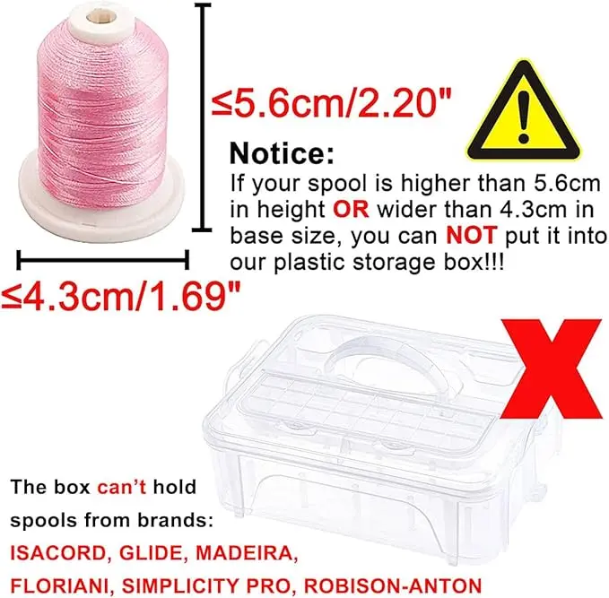 ·Multi type of Spools to Store:The plastic storage box not only store New brothread 500m & 1000m embroidery thread, but also store lots of mini spools from different brands. A special small storage space on top of the lid can store other small items such as needles, scissors, mark pens, bobbins etc.【NOTE:They are NOT suitable for commercial, industrial or jumbo size spool! The spool height should be≤5.6cm/2.2"; the spool width should be≤4.3cm/1.69". See 2nd photo for Size Adaptation Reference!!】
