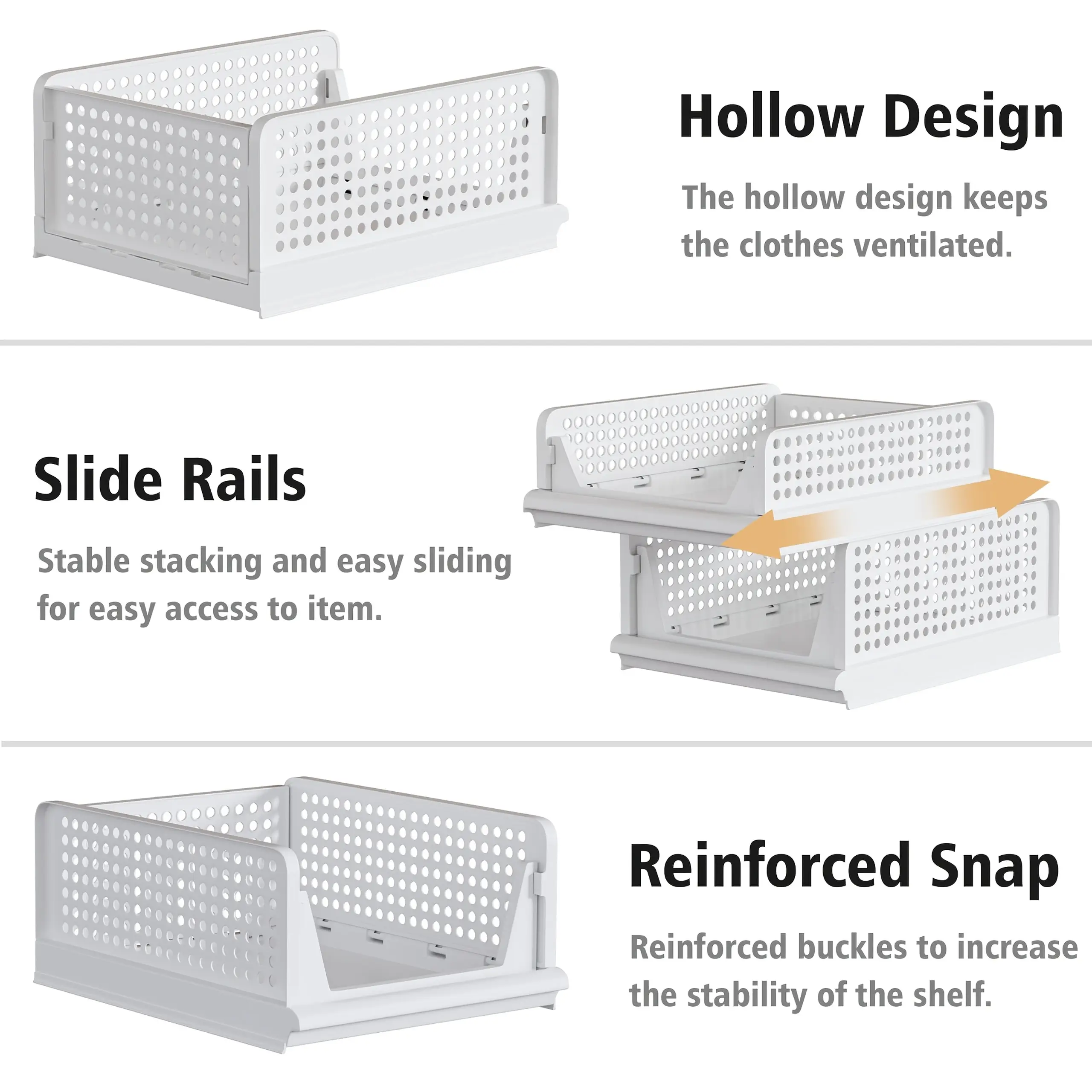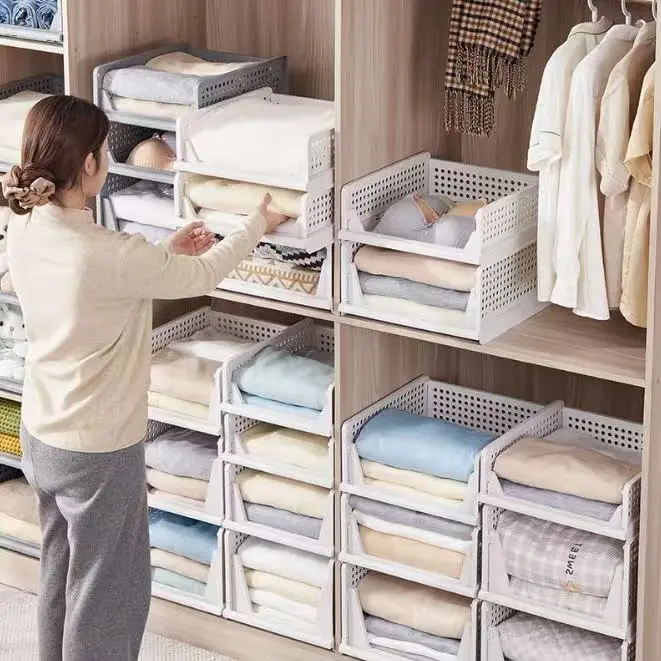 These stackable plastic storage baskets are designed to maximize your closet, bedroom, bathroom, or office space while keeping your clothes, towels, accessories, and small items neat and easy to find.