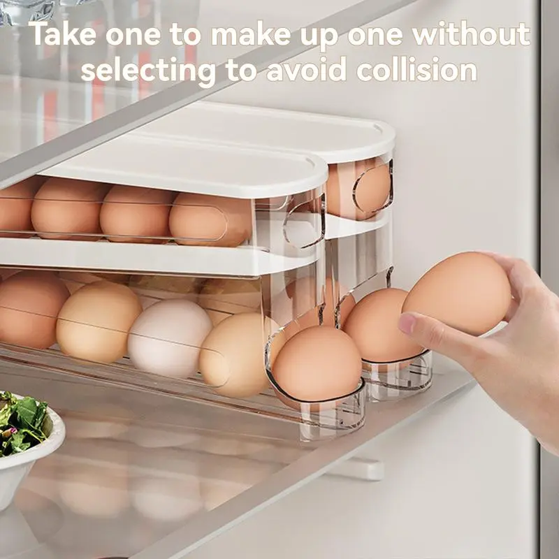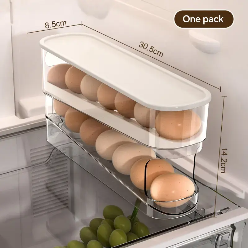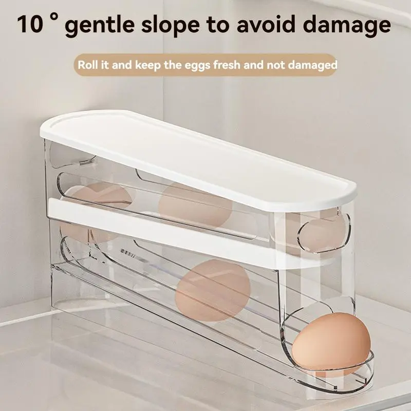 Effortless Egg Access: Transform your fridge organization with our groundbreaking double-layer stackable egg dispenser. By effortlessly sliding the top layer, eggs roll down a convenient ramp for easy access—eliminating the hassle of searching for the right egg. Our stackable egg holder not only keeps your fridge tidy but also ensures first-in, first-out egg rotation, so you always use the oldest eggs first. Space-Saving Design: Say goodbye to cluttered fridges with our user-friendly vertical egg holder, designed for seamless integration into your refrigerator. This innovative egg storage solution can hold up to 12 eggs in a compact, space-efficient design. Streamline your kitchen routine with the added convenience of our double-layer egg dispenser, featuring a top cover with a secure ledge for effortless stacking of multiple units. Durable Plastic Construction: Constructed from premium, durable plastic, our egg Constructed from premium, durable plastic, our egg built to last, offering long Safely store your eggs in this unbreakable refrigerator egg holder while optimizing space in your fridge, countertop, or cabinet. The thoughtful design of this egg stacker ensures stability and minimizes the risk of breakage, keeping your kitchen clutter-free and well-organized. Transparent Visibility: Our refrigerator egg storage is made from highly transparent material, allowing for easy filling and restocking without the need to open the box. This feature helps you keep track of your egg inventory, ensuring you always have enough on hand when needed. Enjoy smooth egg movement with our clear rolling egg dispenser, designed to prevent breakage while providing a clear view of your eggs. Versatile Usage: Versatile and adaptable, our fridge egg organizer is ideal for use in the refrigerator, freezer, kitchen, dining table, pantry, or even during camping trips. It's the perfect solution for all your egg storage needs, ensuring you enjoy fresh eggs wherever you go. The ventilation holes on the back of our auto-rolling egg holder promote proper air circulation and help prevent odors. This design also ensures easy access to your eggs at all times, adding convenience to your daily routine. Tidy & Organized Fridge: Our rolling egg dispenser provides a designated spot for your eggs, helping keep your fridge organized and clutter-free. The sleek design of this refrigerator egg holder blends seamlessly with any kitchen decor, adding both functionality and aesthetic appeal to your space.