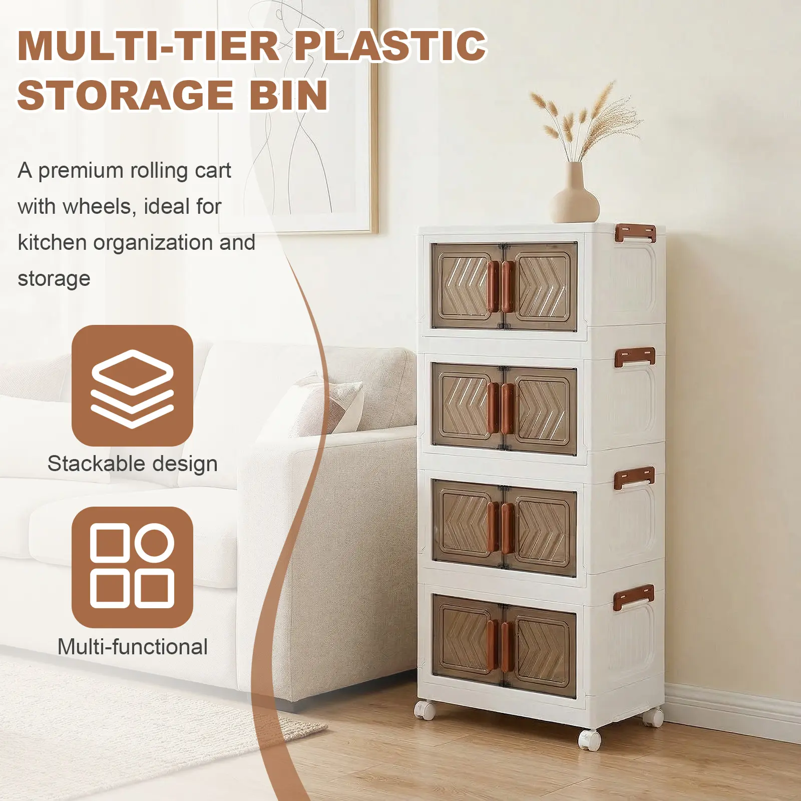 Easy to assemble and move - The stylish plastic container with a lid can be installed without tools. It comes with 2 lockable wheels. On each top side of each layer, there are matching grooves and snap rings, which can firmly lock the cabinet and facilitate the movement of the stackable storage box with wheels or the cleaning of the floor of the kitchen or bathroom organizer and storage cabinets.