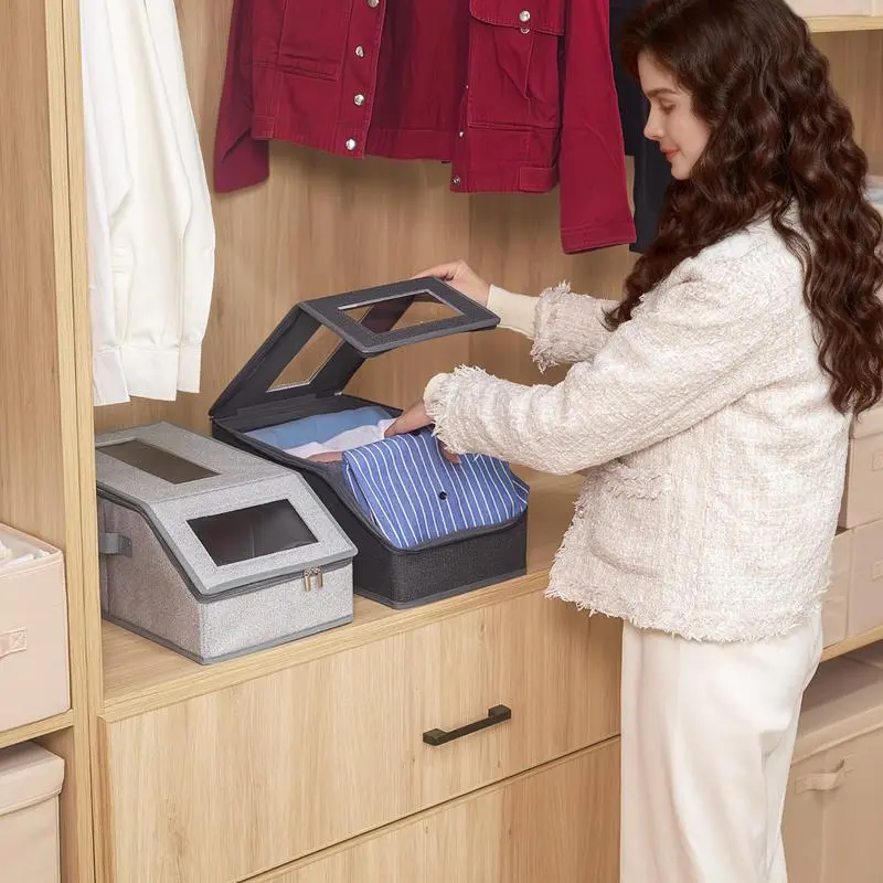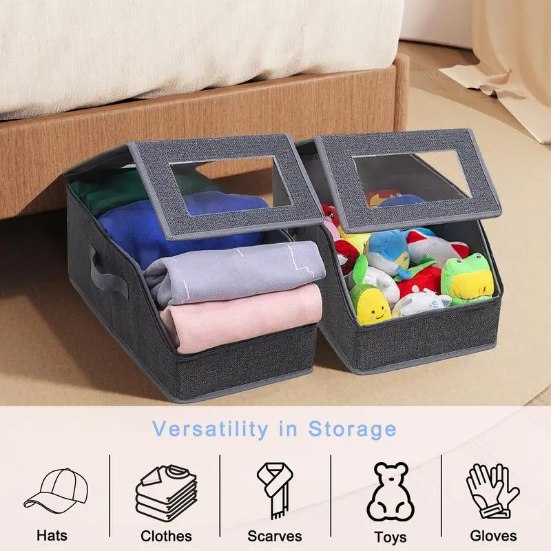 【Gift Box】TRZZ Foldable Bed Sheet Storage Bins 4-Pack | Queen/King Size Oxford Fabric Organizers with Transparent Windows & Reinforced Handles | 15"×13"×5"