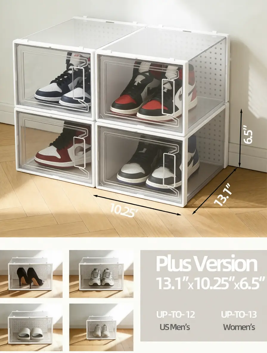 Designed specifically for sneakers and boots, these boxes offer ample internal space to easily store and display shoes up to US Men's Size 12. The extra height and width ensure a comfortable fit for various shoe styles, making efficient use of vertical space.