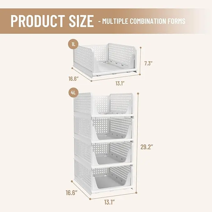 ·Product Specifications:Dimensions:Small Size: 16.6" x 13.1" x 5.55" (L x W x H)Large Size: 16.6" x 13.1" x 7.32" (L x W x H)Set Options: Available in sets of 2 or 4Weight Capacity: Each shelf can hold lightweight items such as shoes, clothes, toys, snacks, and files.
