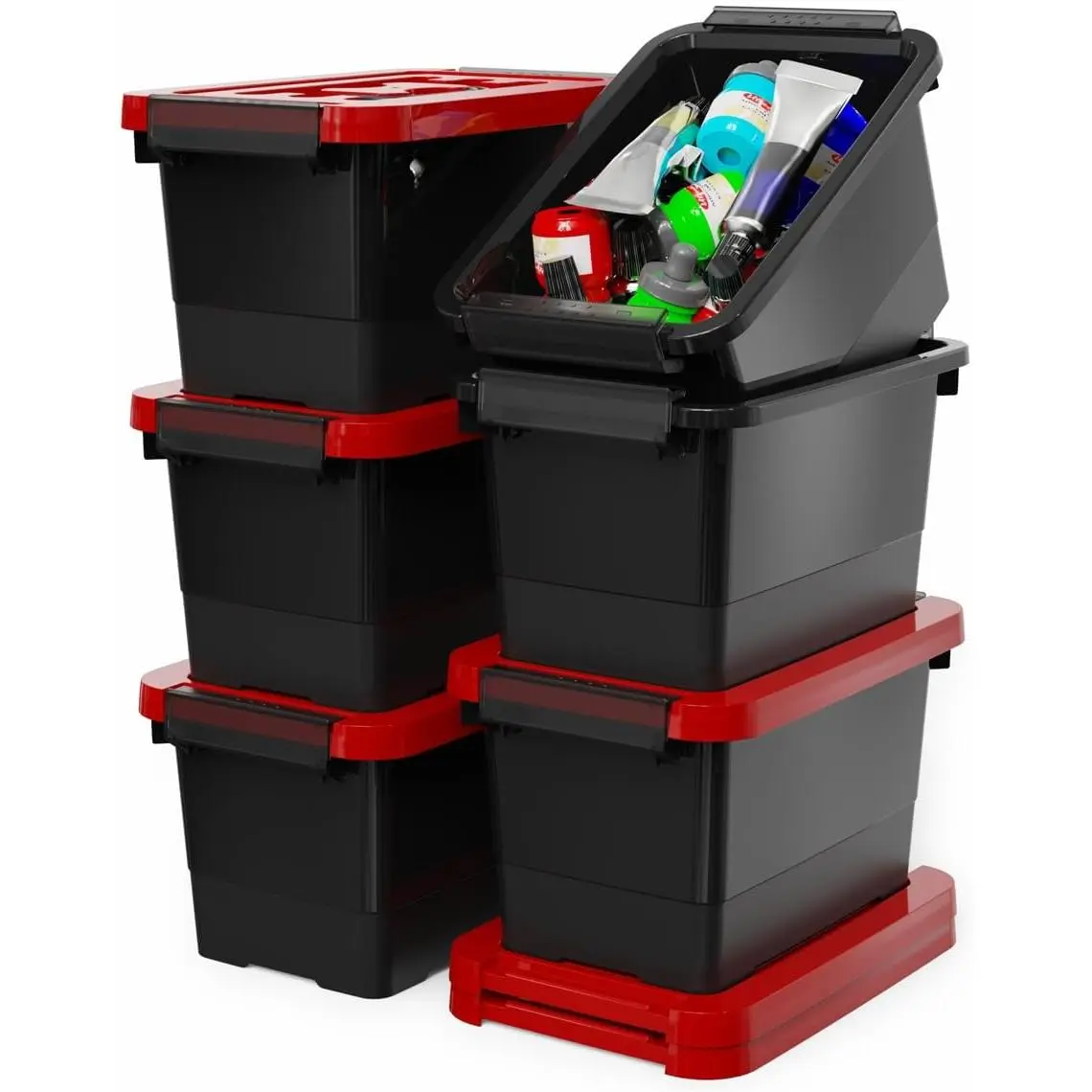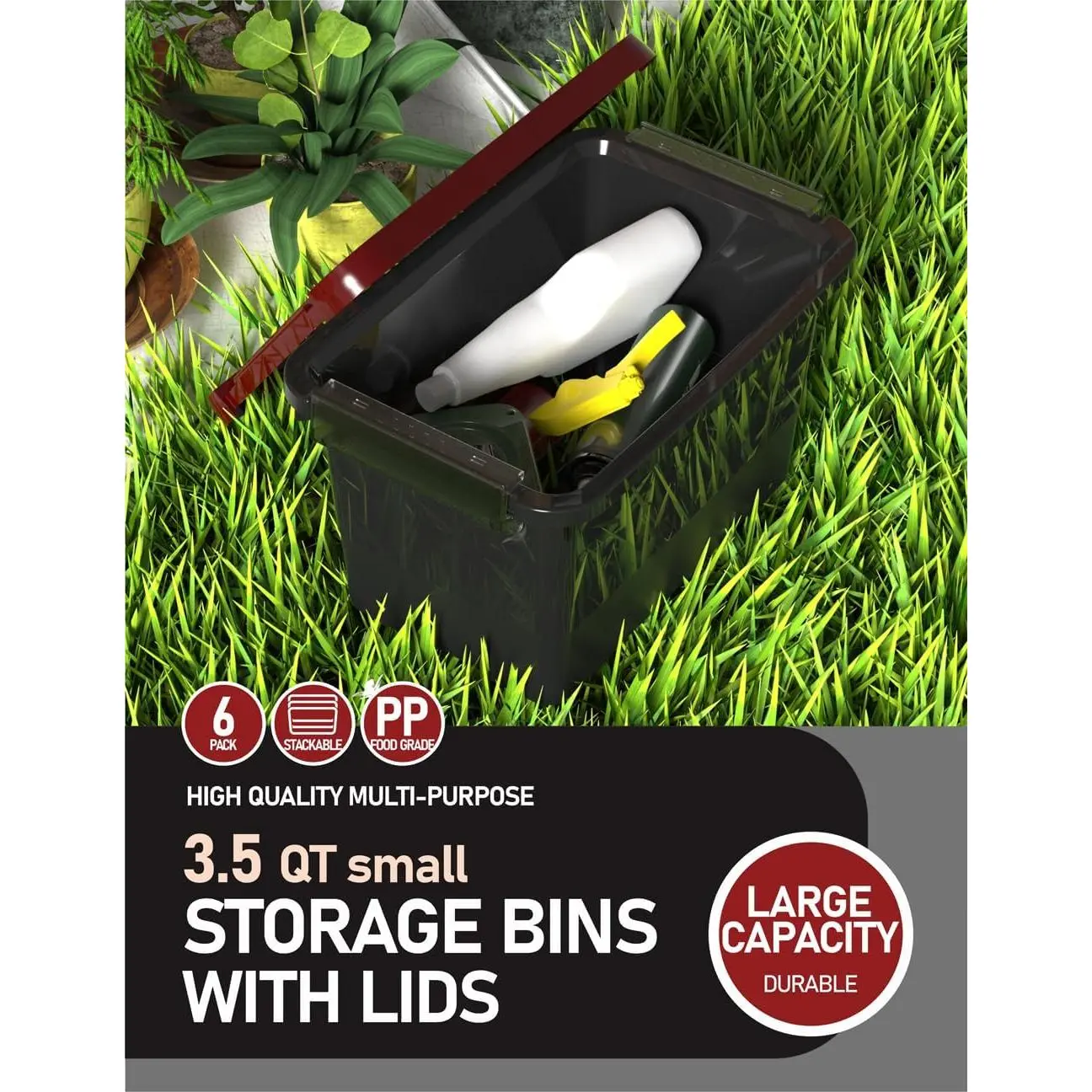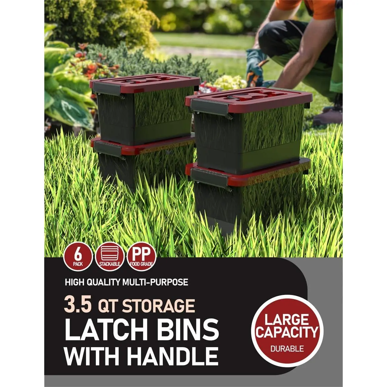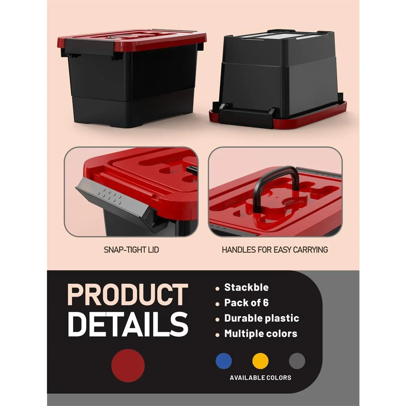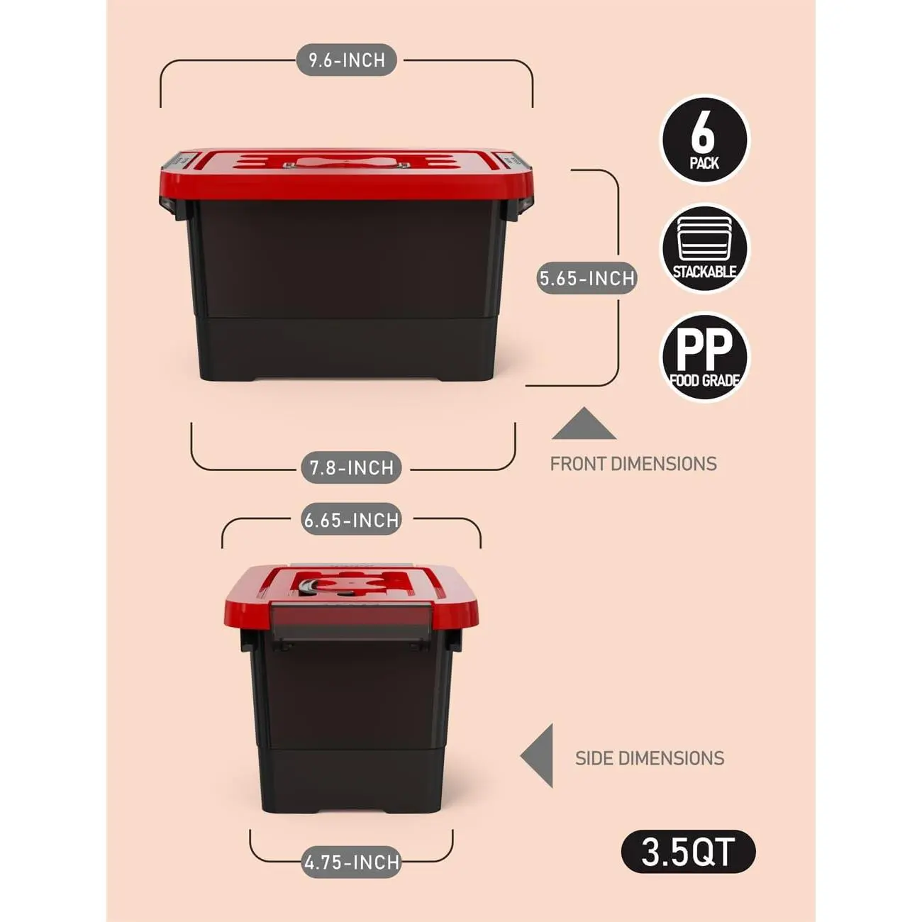 Plastic Storage Bins with Lids and Latch, 6-Pack Small Stackable Plastic Organizing Box with Buckle and Handle, 3.5 Quart Durable Nestable Totes Containers (Black/Red)