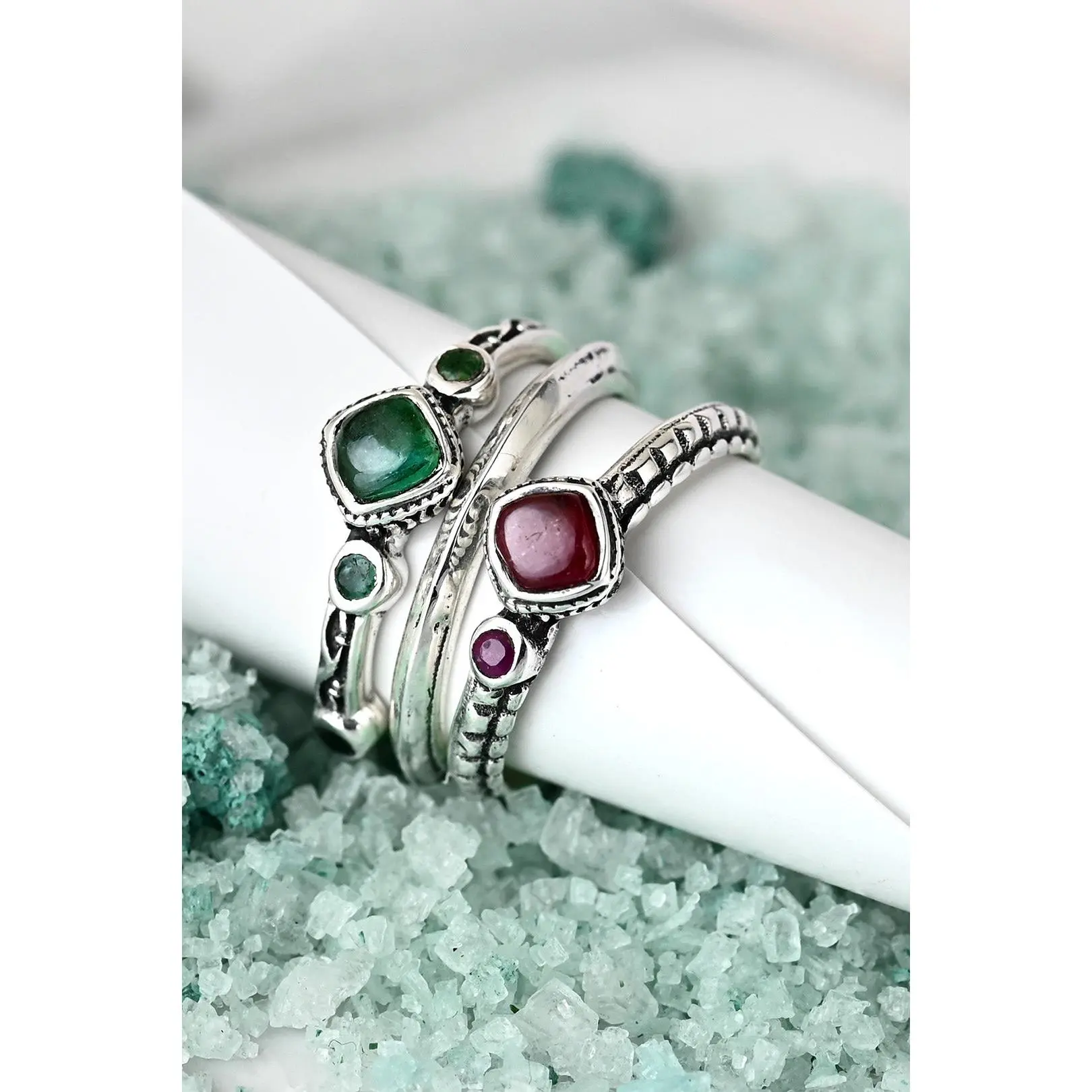 An exquisite Ruby and Emerald stacking ring set to add a unique boho flare to your look! This sterling silver set features 3 rings that you can wear together or separately. Ruby can symbolize passion, wealth and love. Emerald can symbolize love too as well as balance, patience, harmony and friendship.