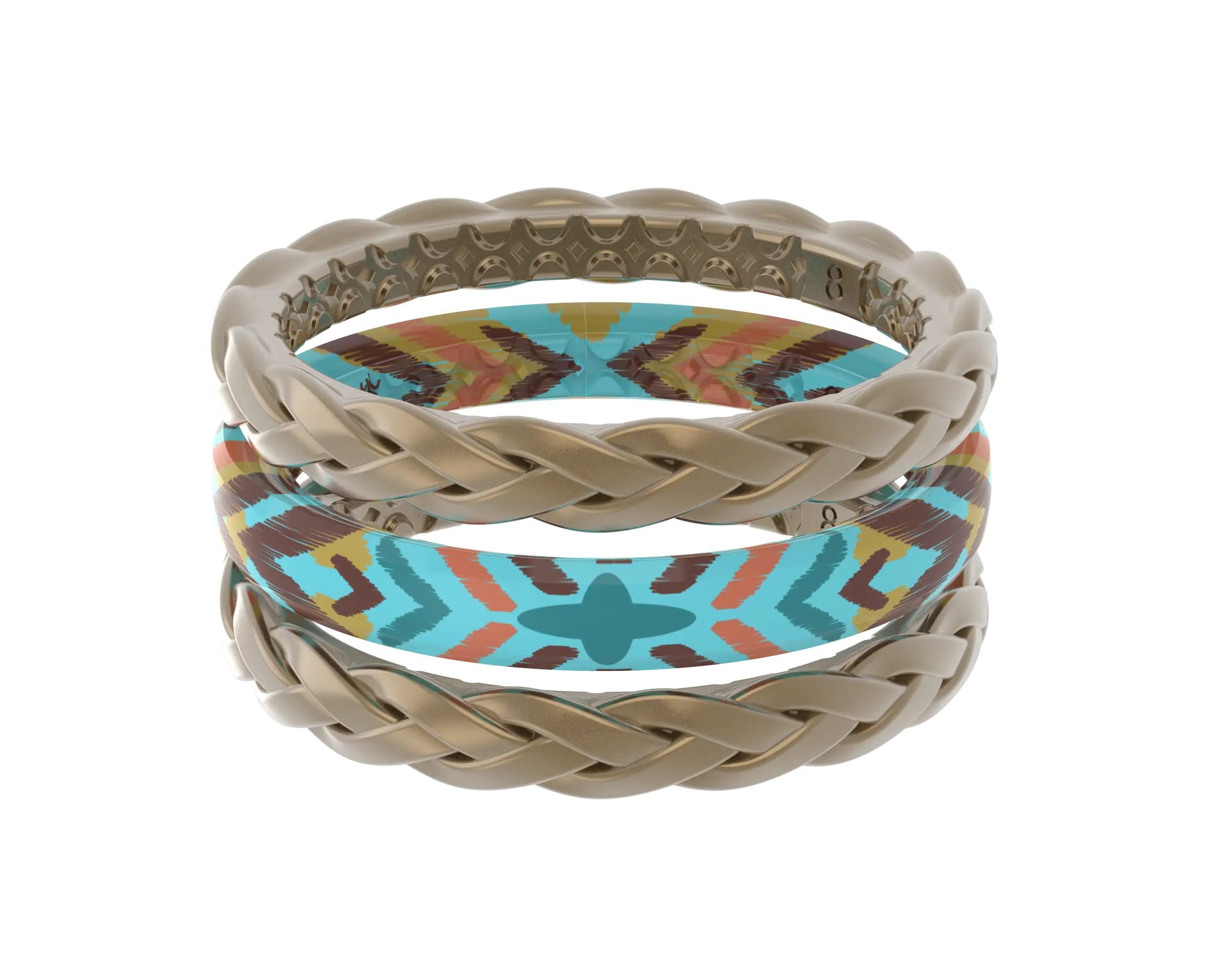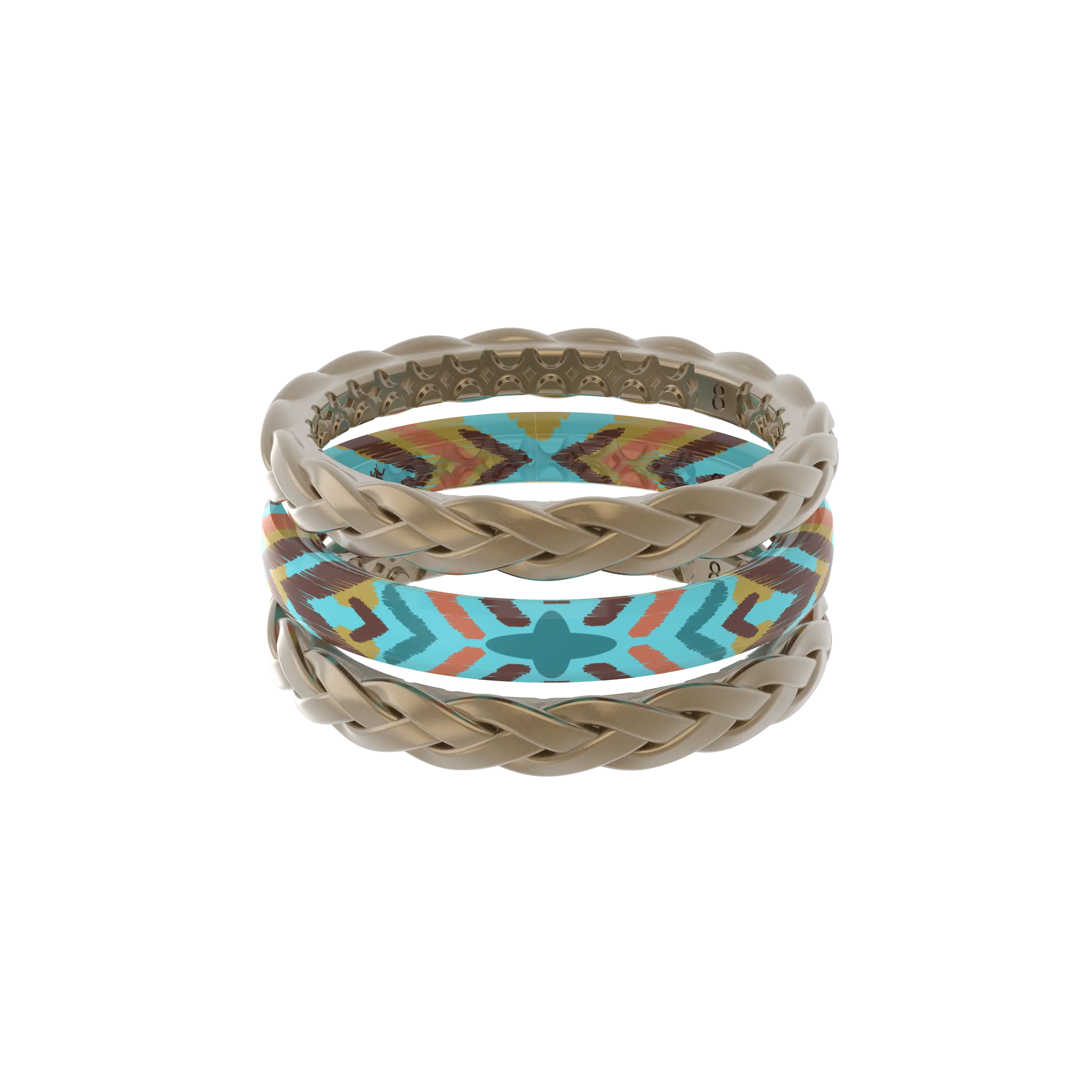 Three rings in one, this unique stackable set comes with two gold outer braided bands and one printed arrow middle band, specially designed by Katie herself.