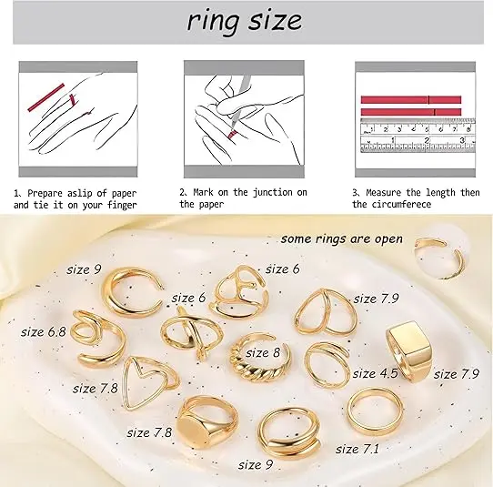 These rings are waterproof, hypoallergenic, and come in eco-friendly packaging. They maintain their color, ensuring durability. Available in sizes 6, 7, 8, and 9, these 14k gold-plated rings are a timeless addition to any collection.