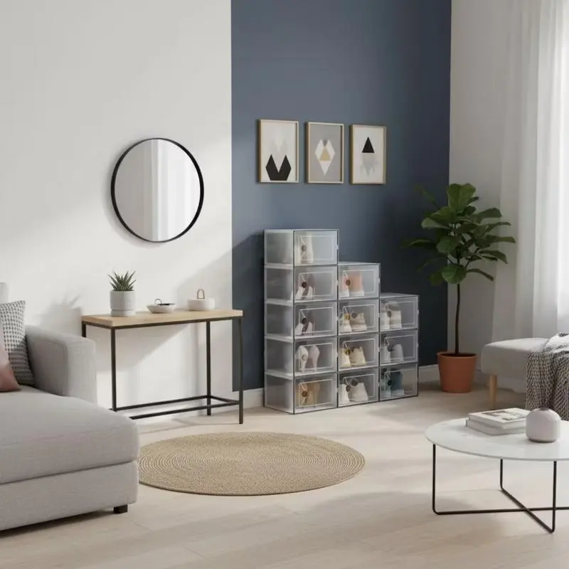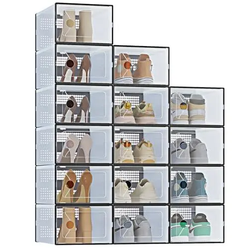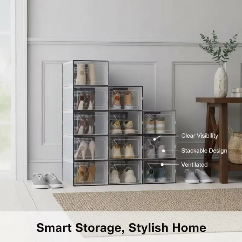 Stackable Shoe Storage Boxes with Lids, Modular Large Shoe Rack & Organizer Shelf, Transparent Front Panel for Easy Display & Identification, Breathable Hole Design to Keep Shoes Fresh, Sturdy Interlocking Structure for Customizable Storage