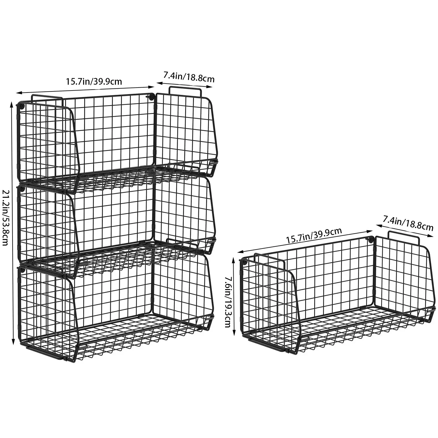 ·Dimension&Care: Each set of metal wire baskets contains 3 same baskets. One of each size:15.7" W x 7.4" L x 6 x 7.6" H. Three baskets stacking size: 15.7W x 7.4" L x 21.2 H " . To clean, wipe with a damp cloth and towel dry.