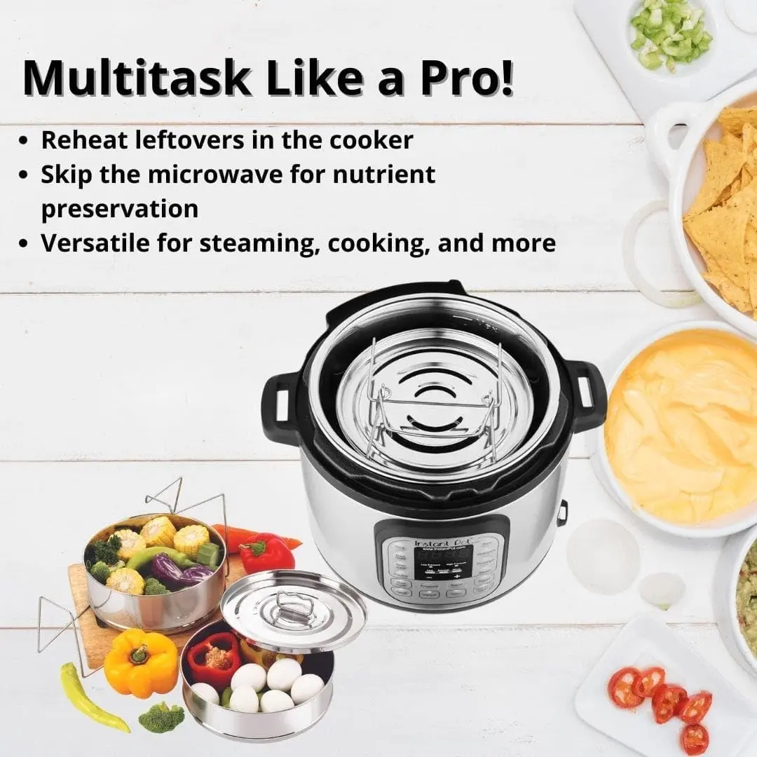 Bake.Boil.Stir-fry.Roast and Grill.All in one accessory for use with Instant Pot.Skip the Microwave.Reheat multiple dishes.Retain Nutrients and Flavor.