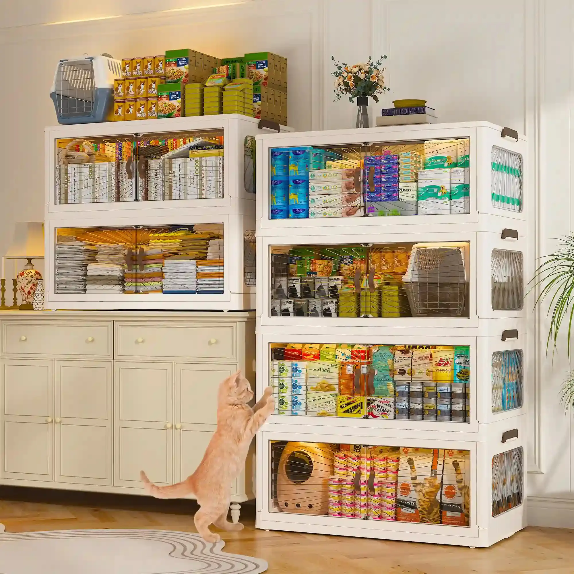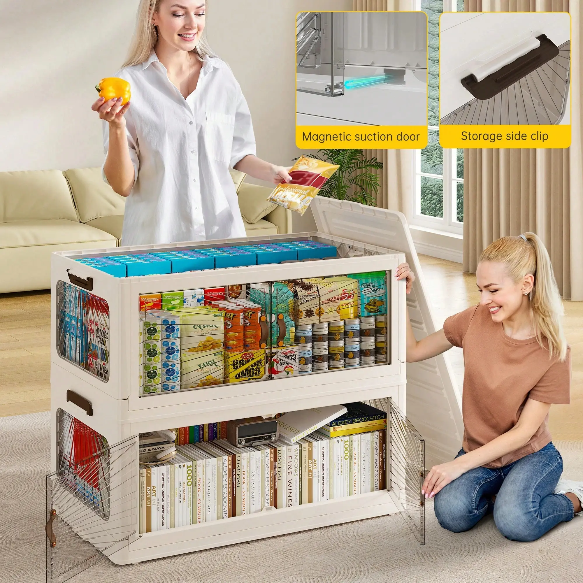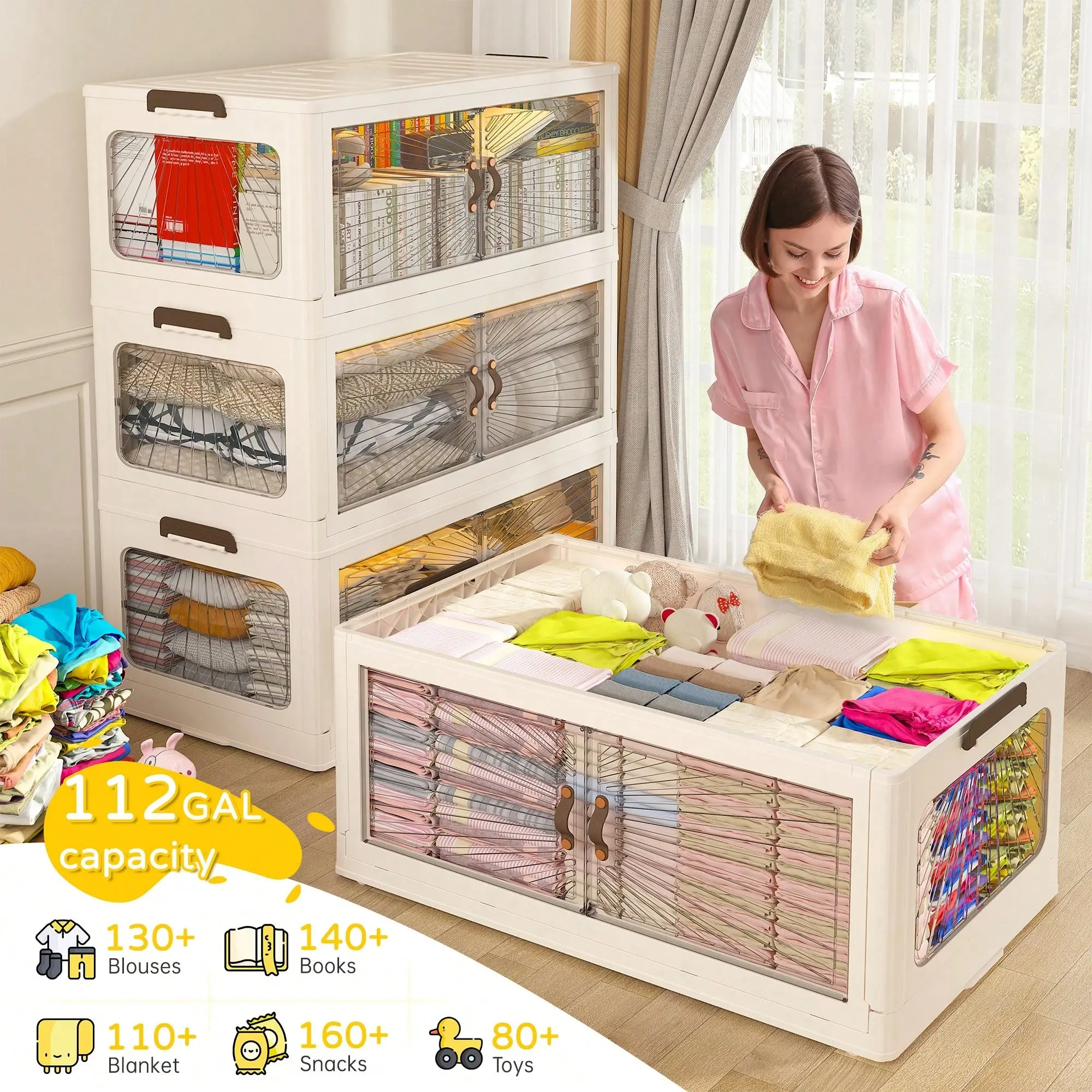 ·Front & Top Openings:These Storage Bins with Lids feature a dual-access design, allowing you to open the front double doors for quick access or the top lid for larger items.Both options are convenient for retrieving small items or packing larger objects.