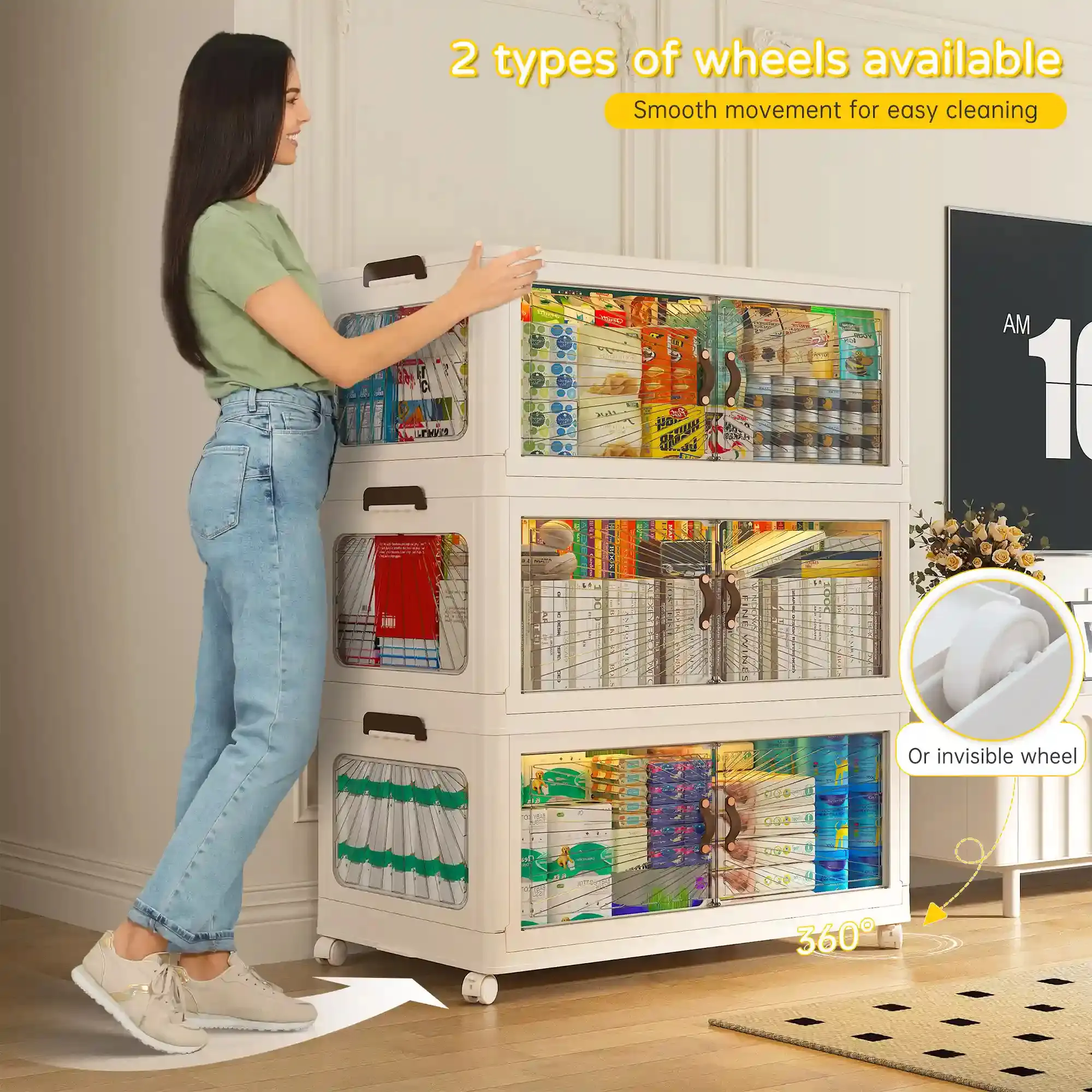 ·Wheeled & Fixed Design:Equipped with 360° swivel wheels and hidden fixed wheels, allowing you to move them effortlessly or keep them firmly in place.Flexibility is key! These stackable storage bins adapt to your needs, ensuring both mobility and stability.