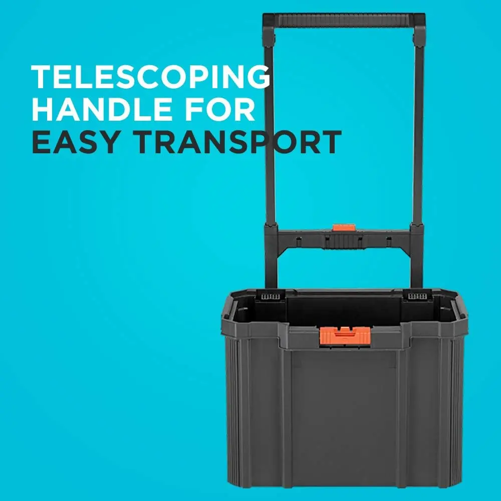 The stackable storage system features two 7 in. rubber coated wheels and an ergonomic, telescoping handle for easy transport.