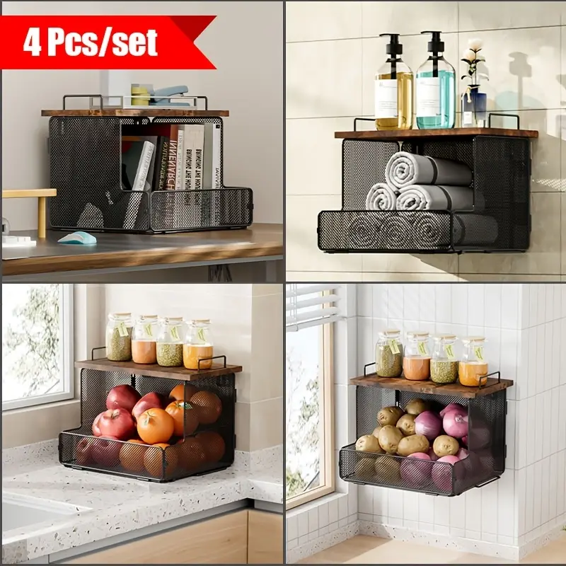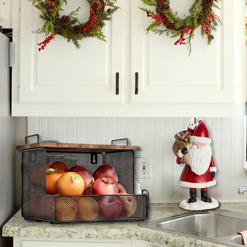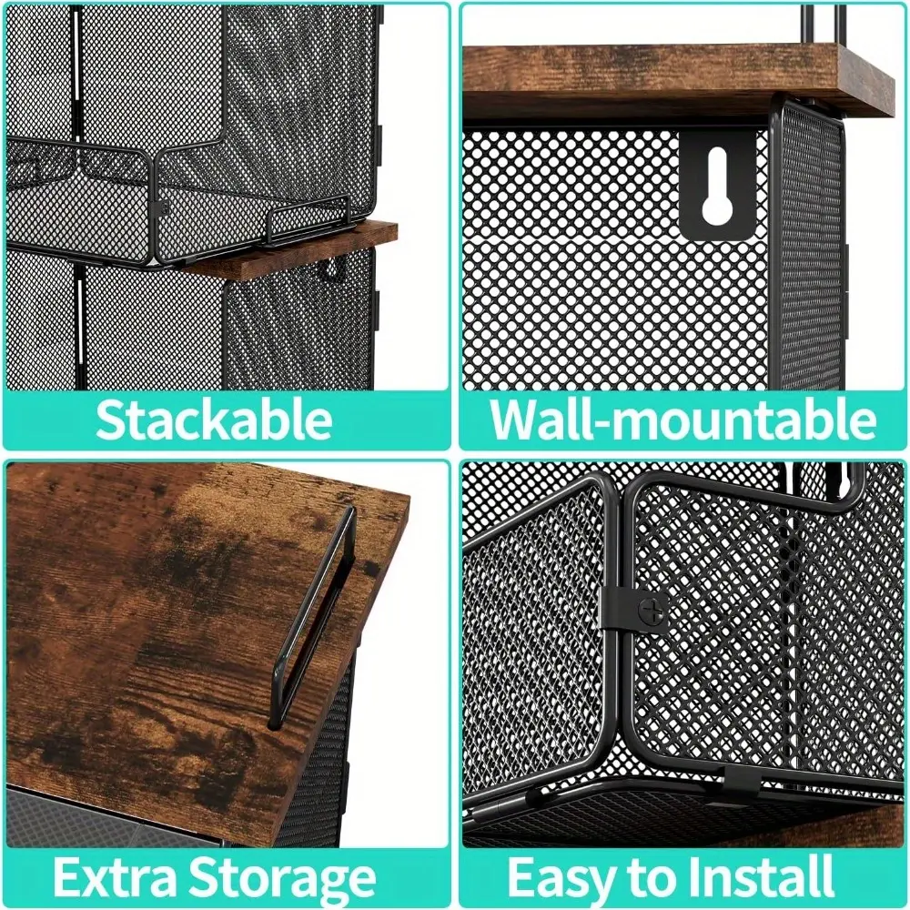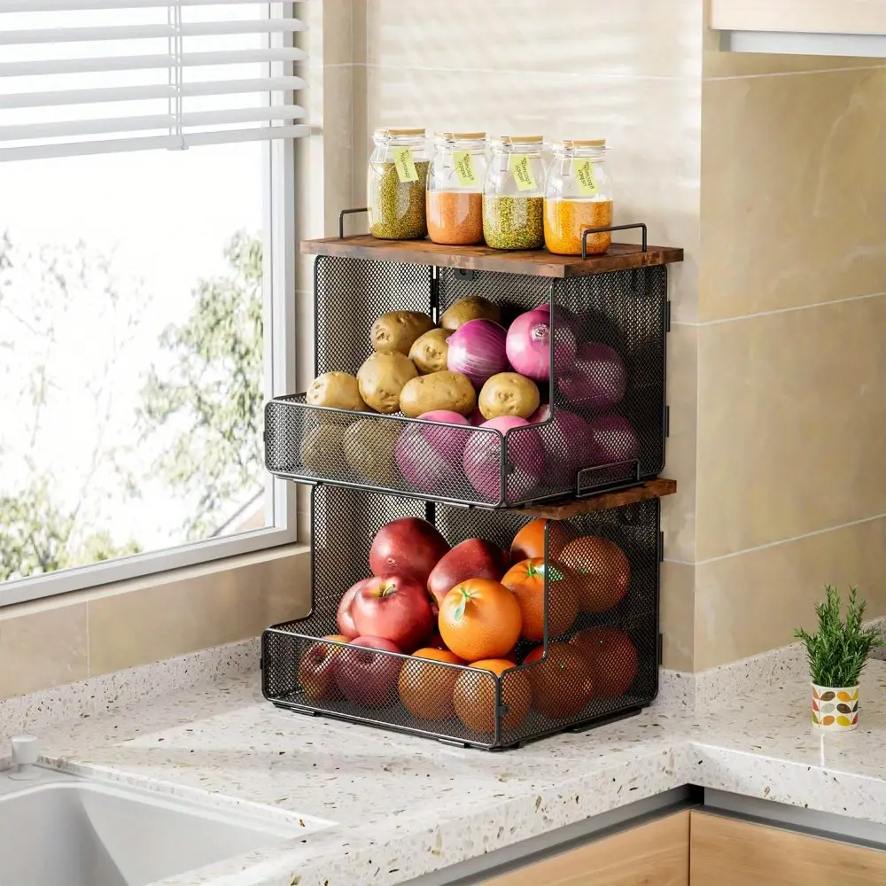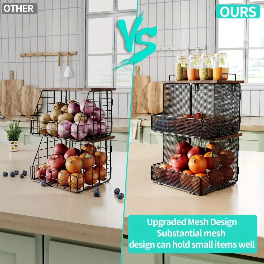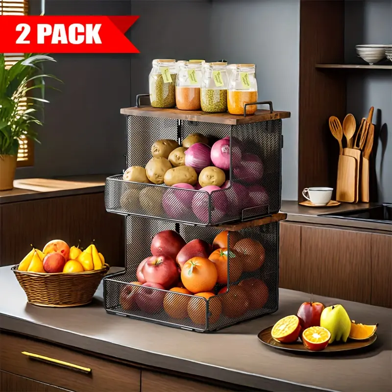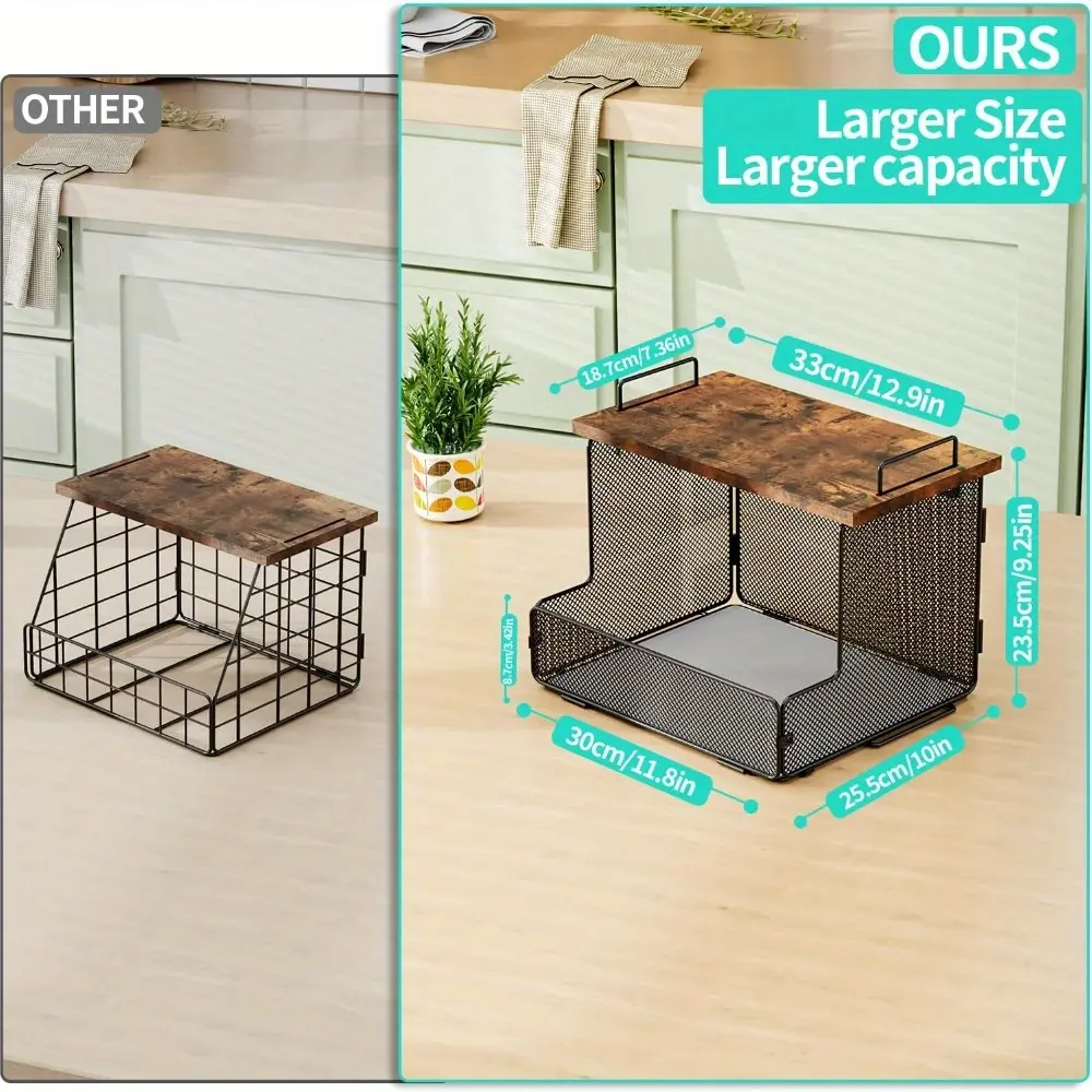 2-Pack Fruit Basket Wire Basket, Stackable Wall-Mounted Countertop Kitchen Counter Organizer for Snacks, Fruits and Vegetables Storage, Onion and Potato Hanging Basket with Wooden Lid