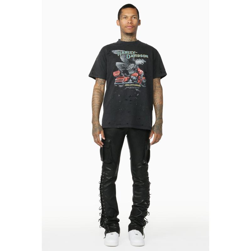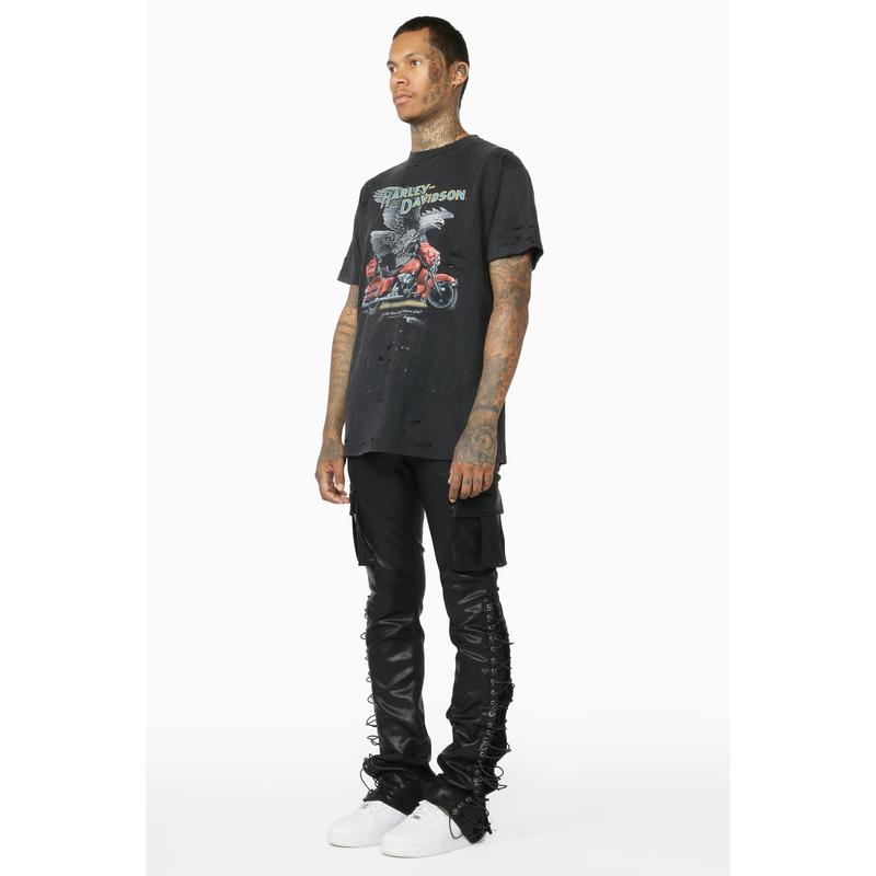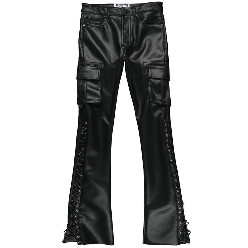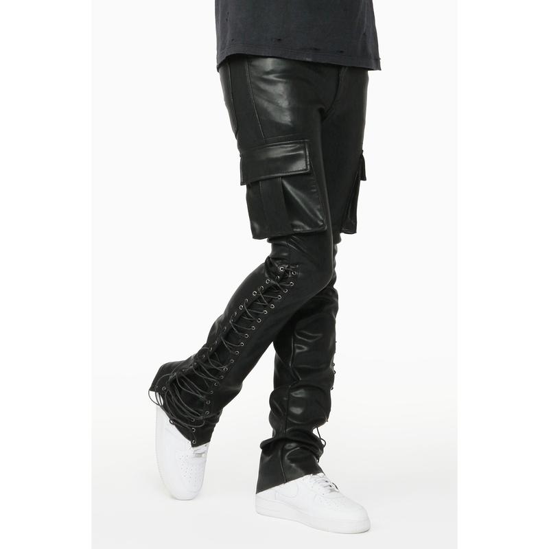A custom stacked flare jean for men in black. Designed with premium faux leather fabric and convertible lace up seams for a must-cop staple piece.
