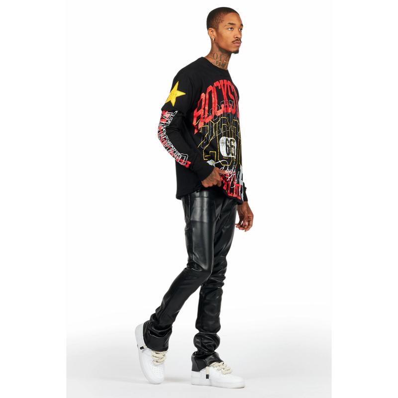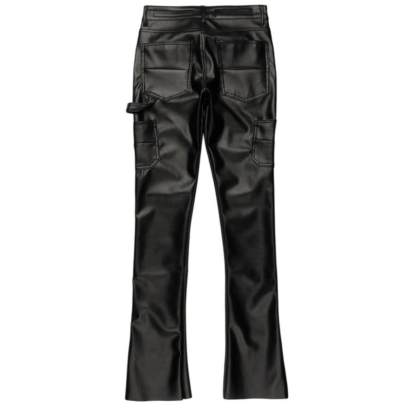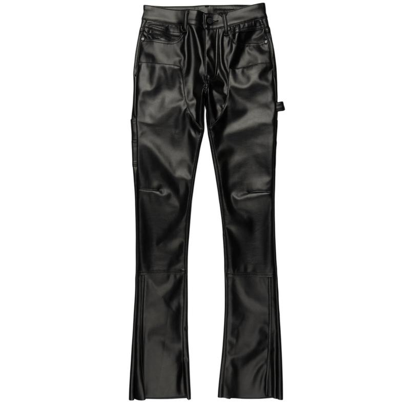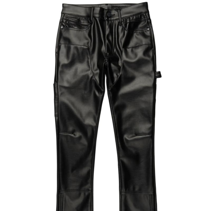 An elevated stacked flare jean for men in black. Designed with PU fabric and distressed detailing for a must-cop streetwear style.