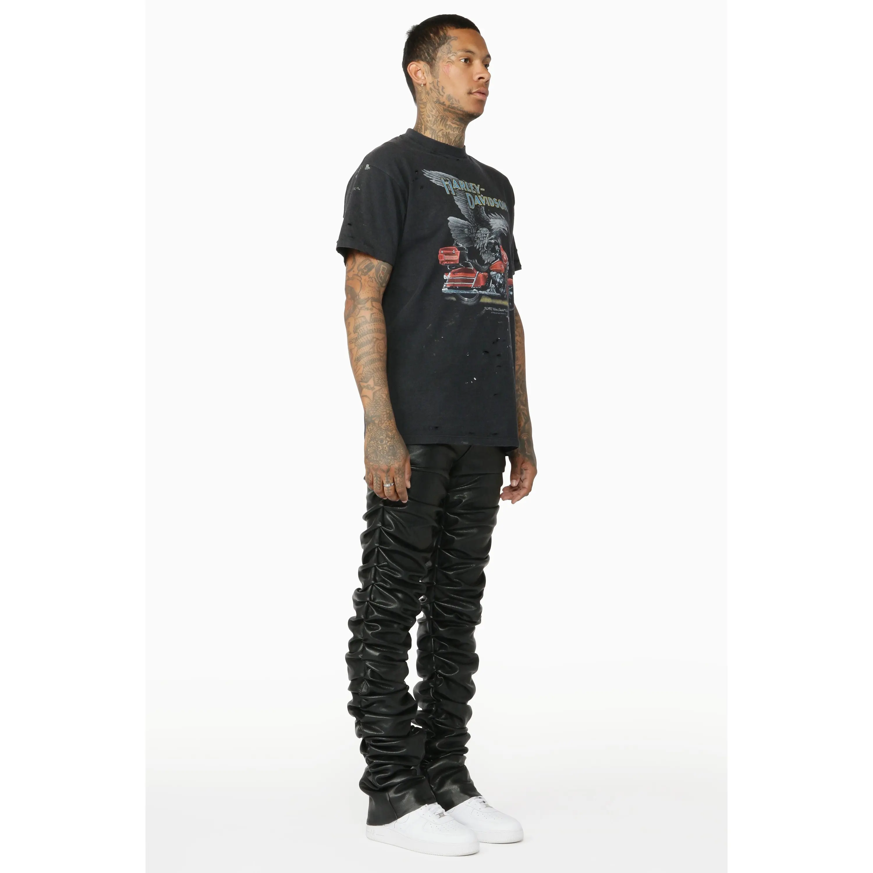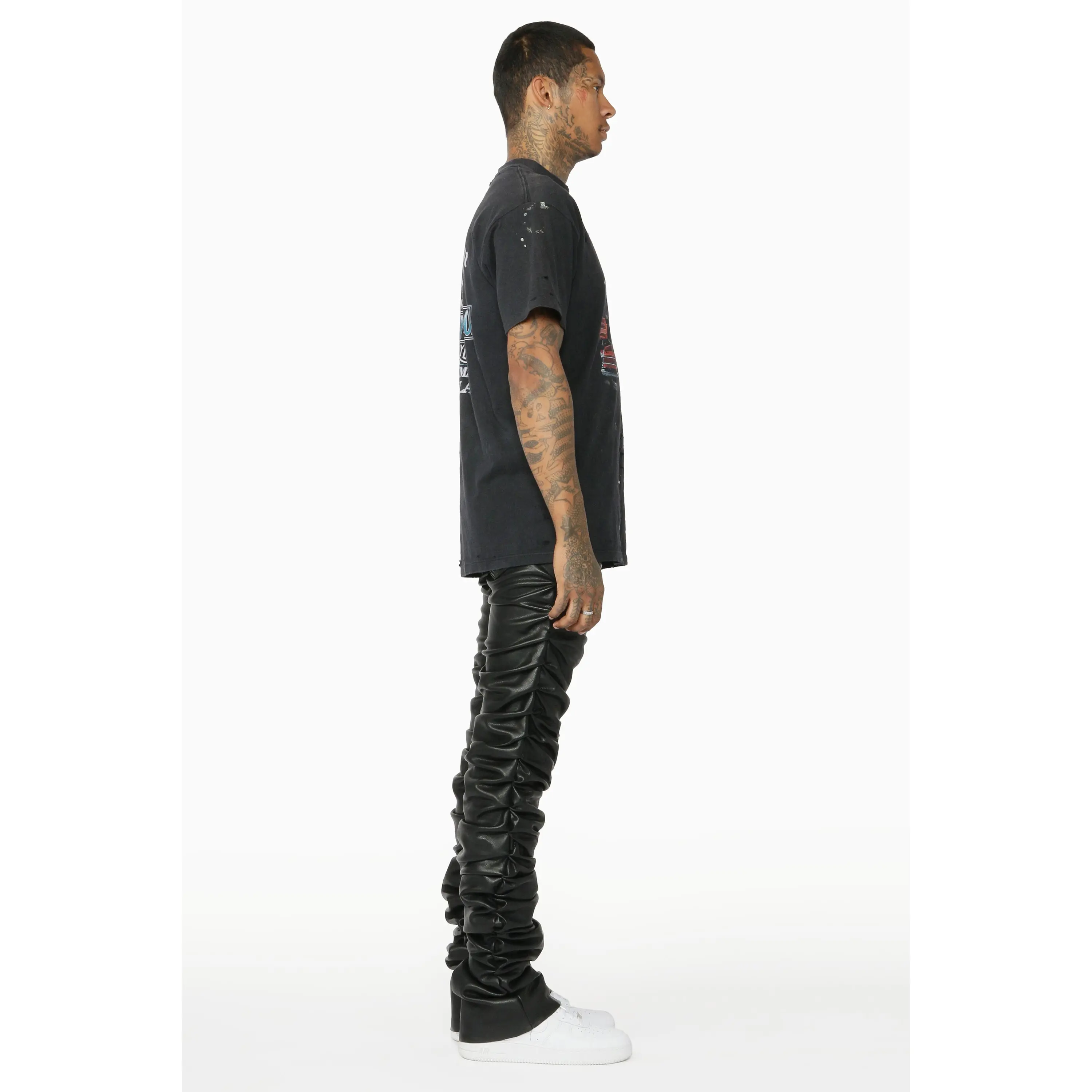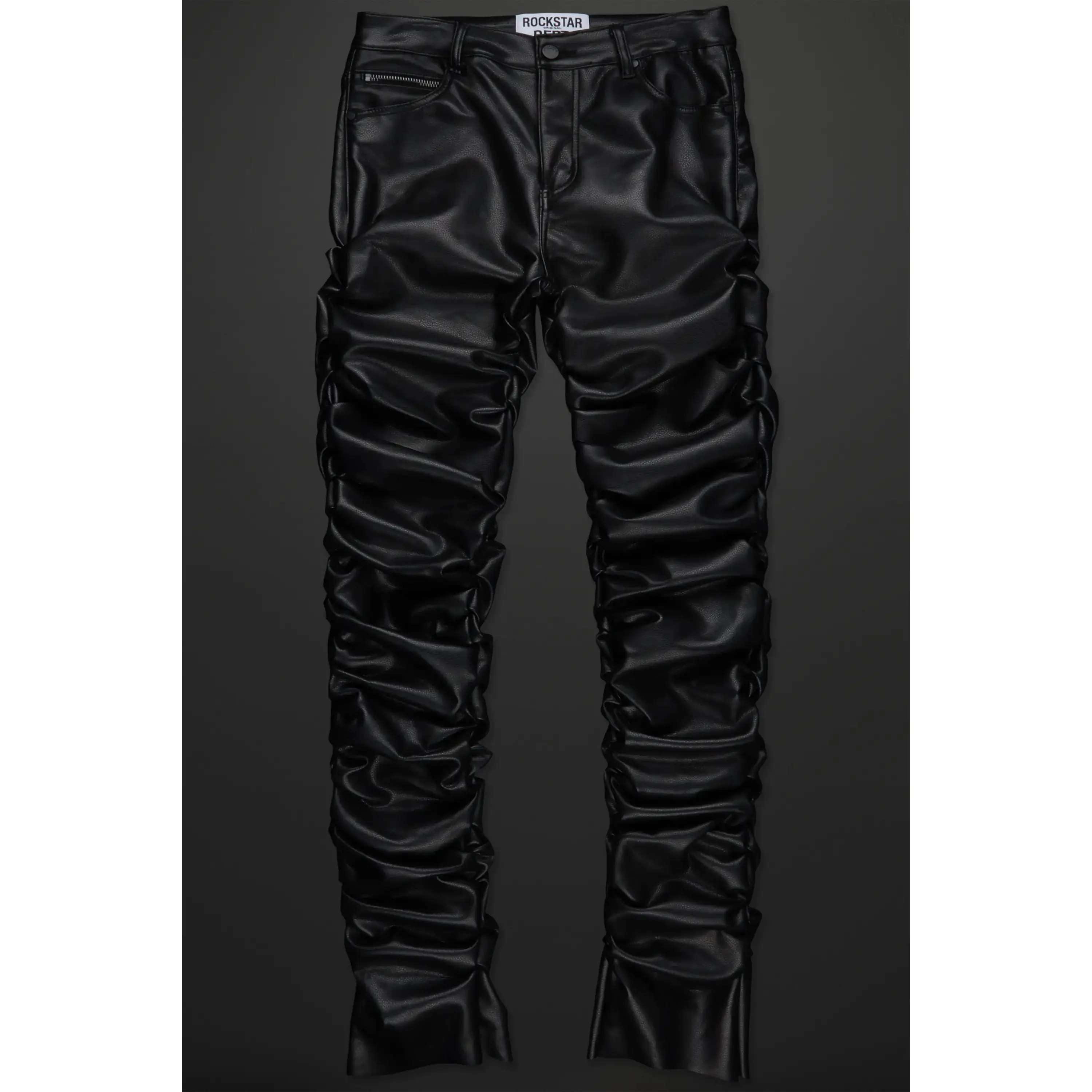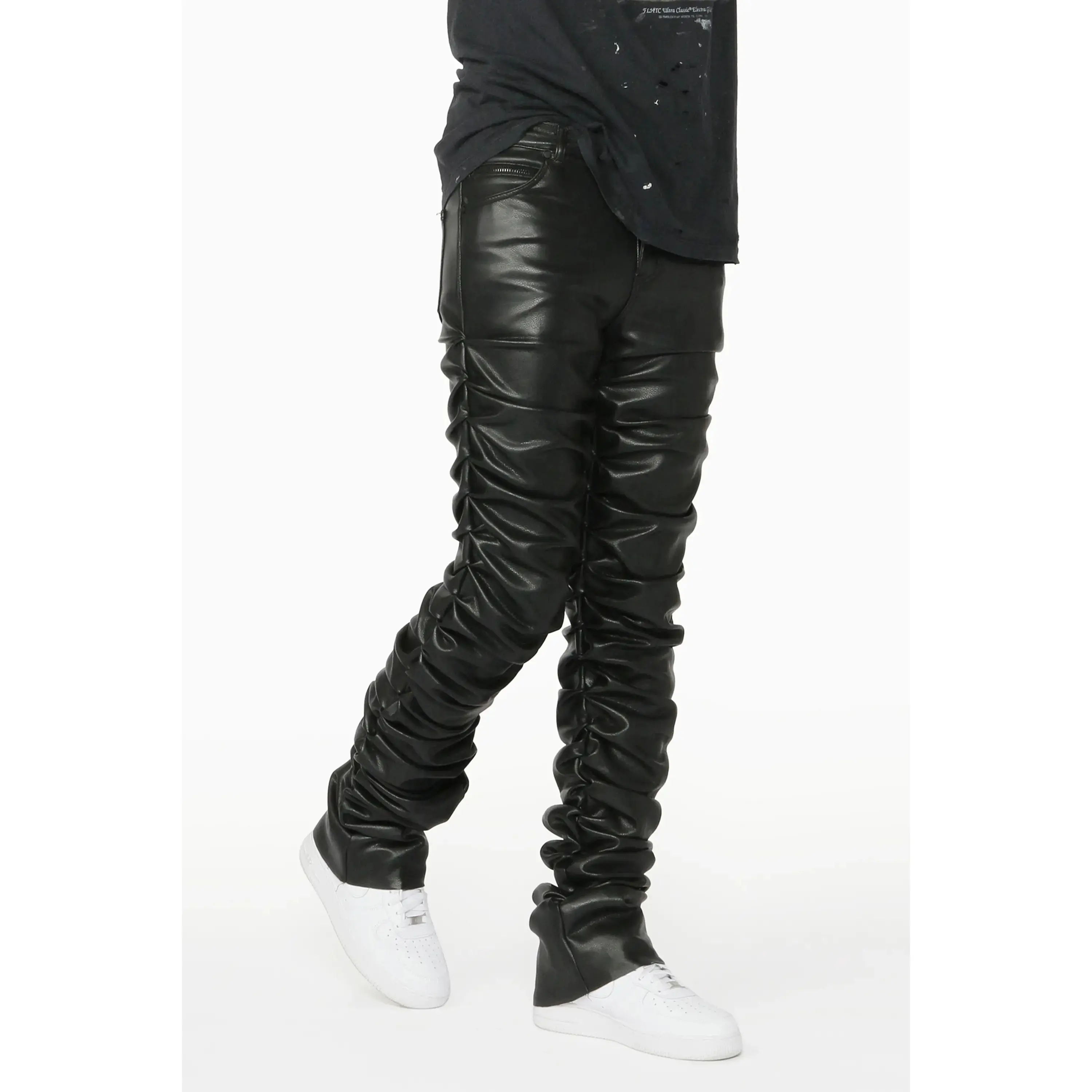 An elevated urban stacked flare jean for men in black. Designed with PU fabric and custom ruched detailing for a must-cop streetwear style.