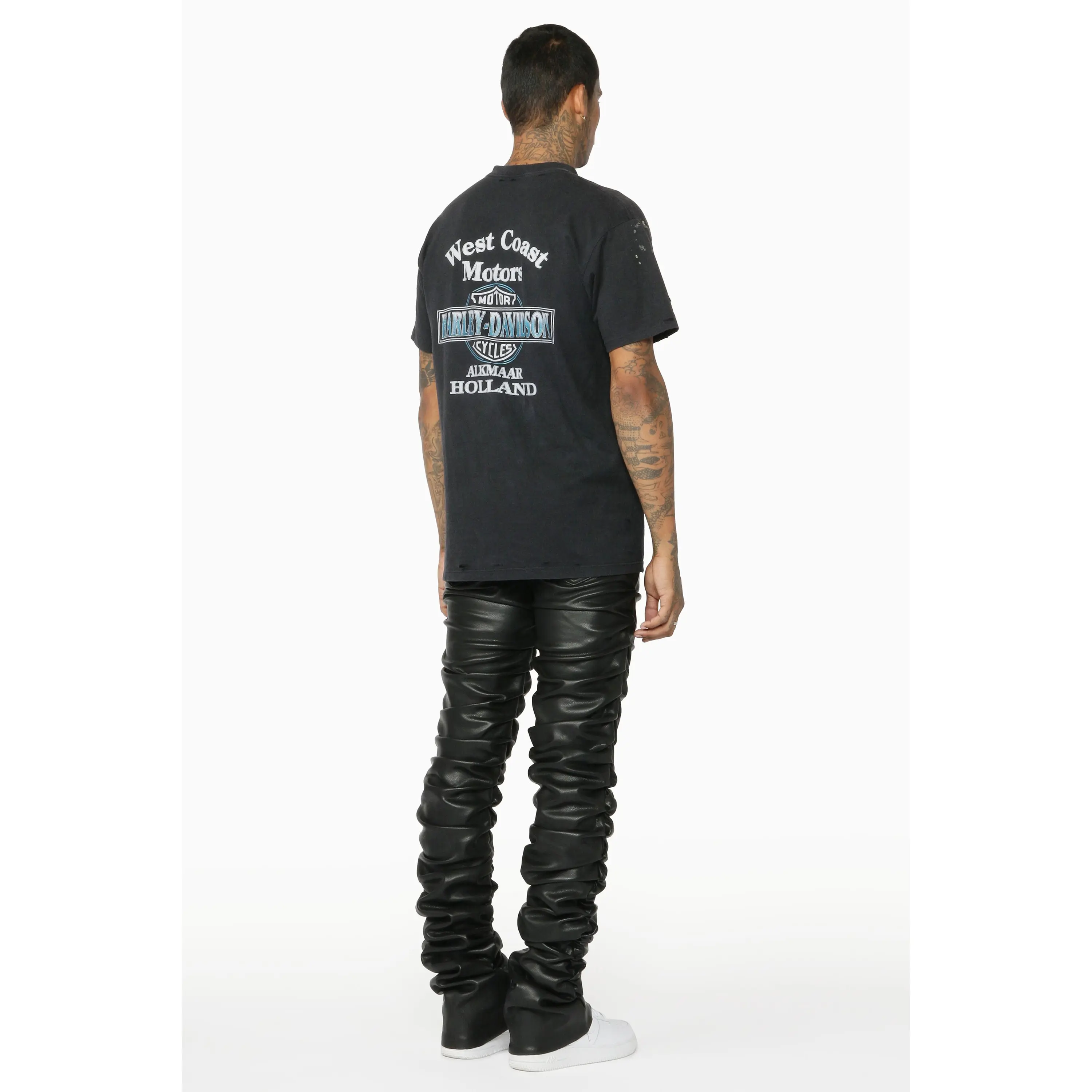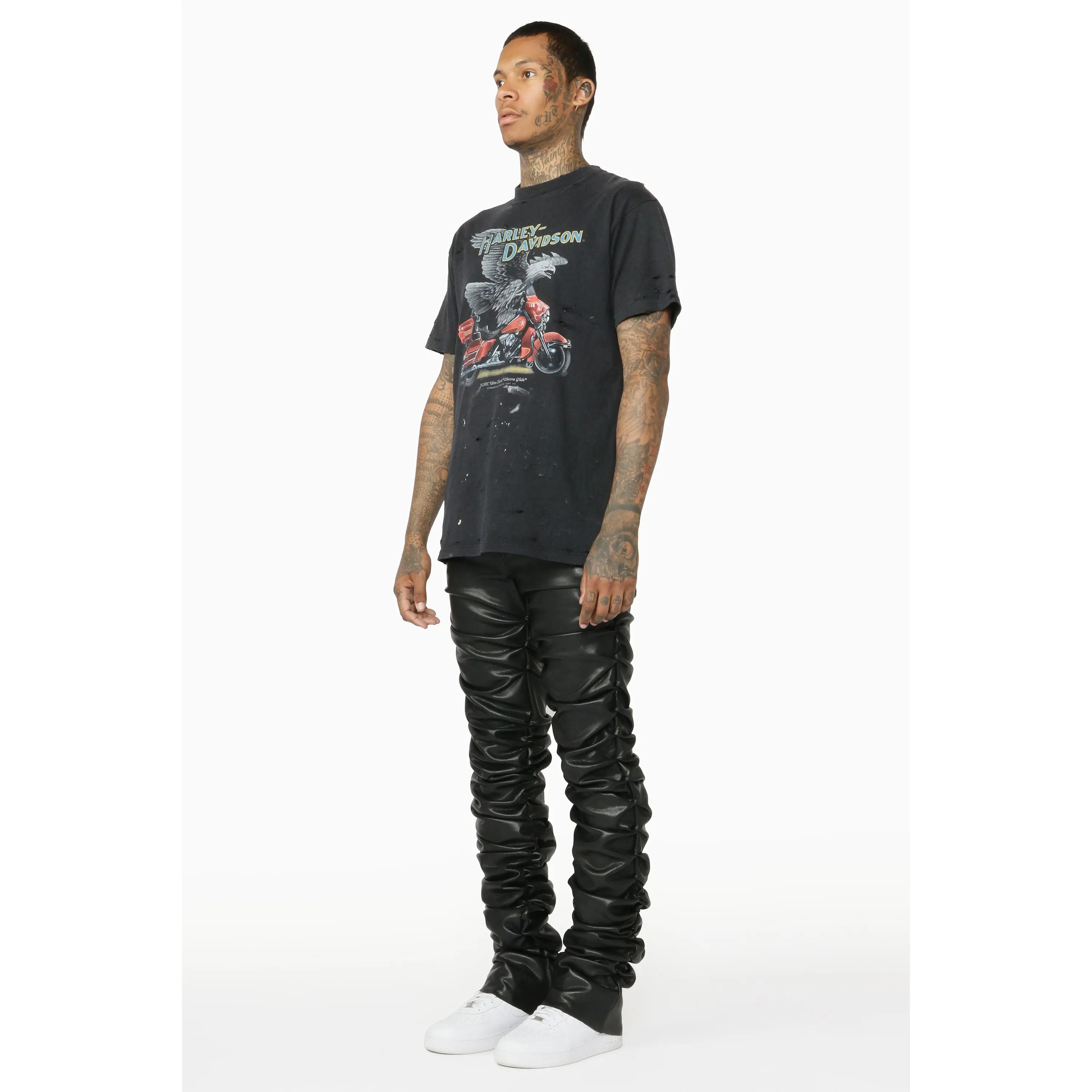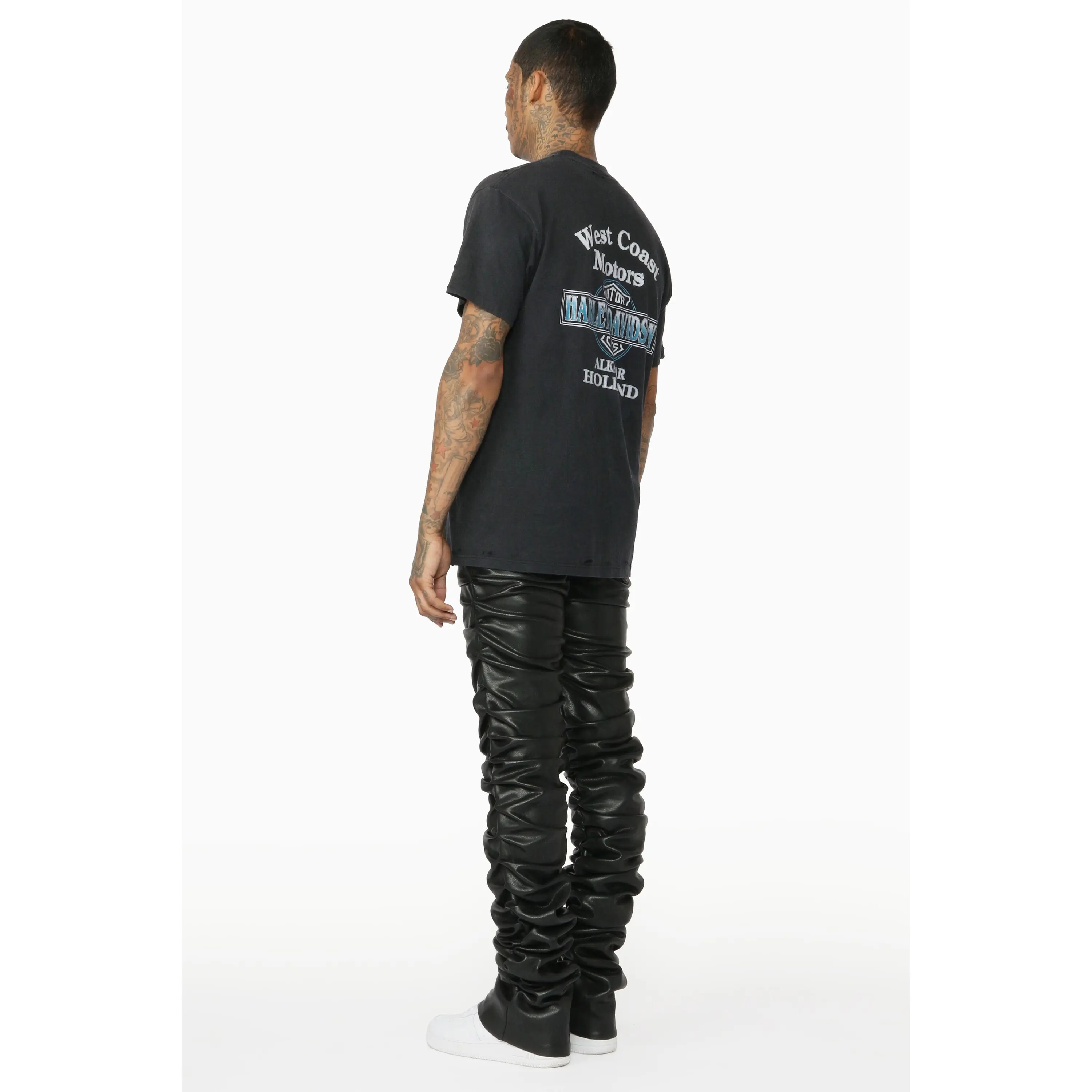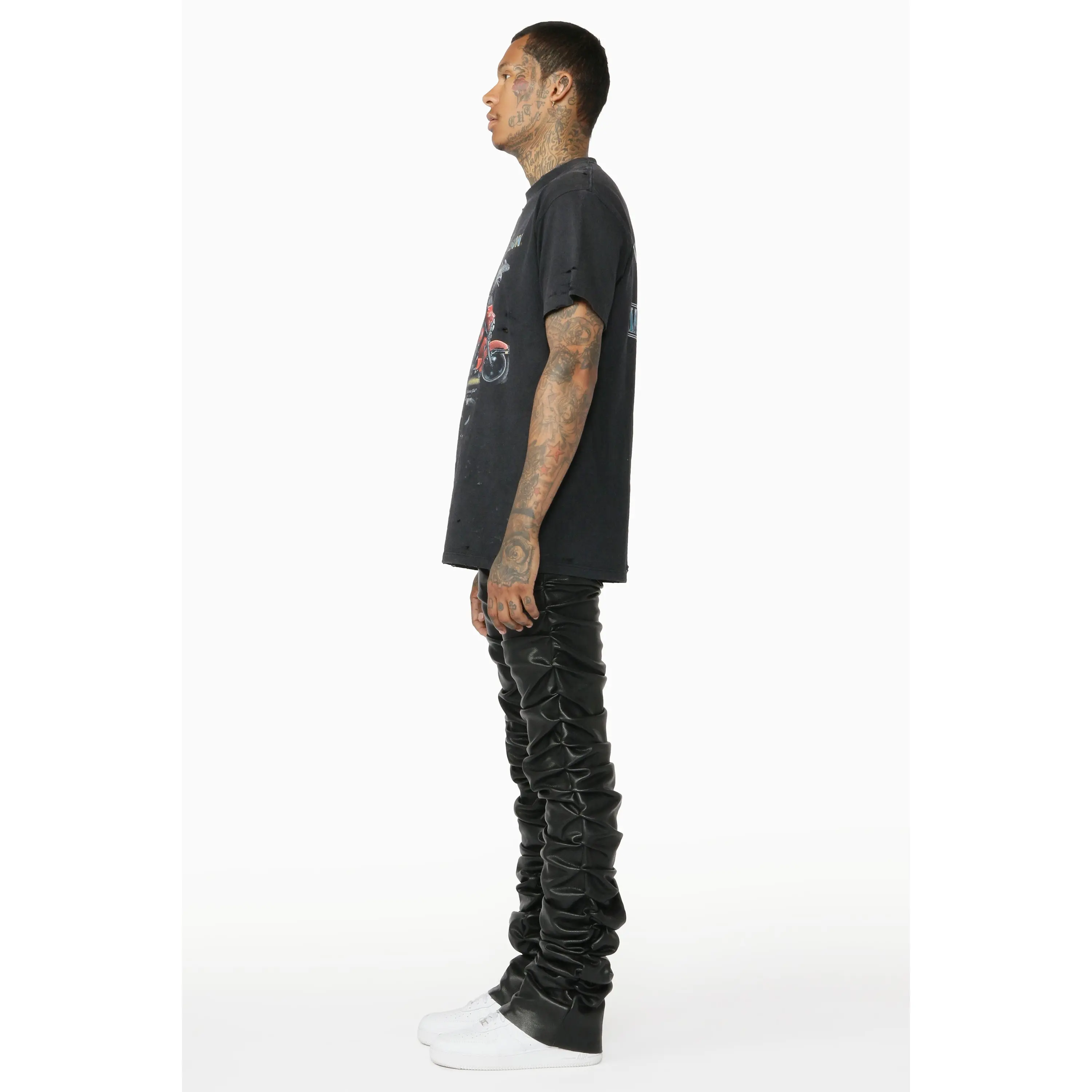 An elevated urban stacked flare jean for men in black. Designed with PU fabric and custom ruched detailing for a must-cop streetwear style.