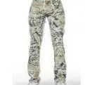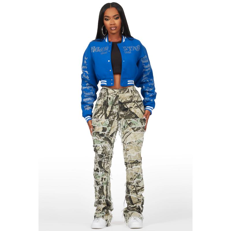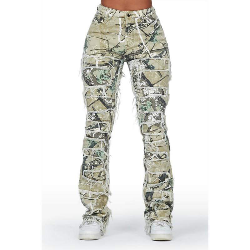An urban stacked flare jean for women in tree camo. Designed with premium fabric and extra long legs for a must-have streetwear style.