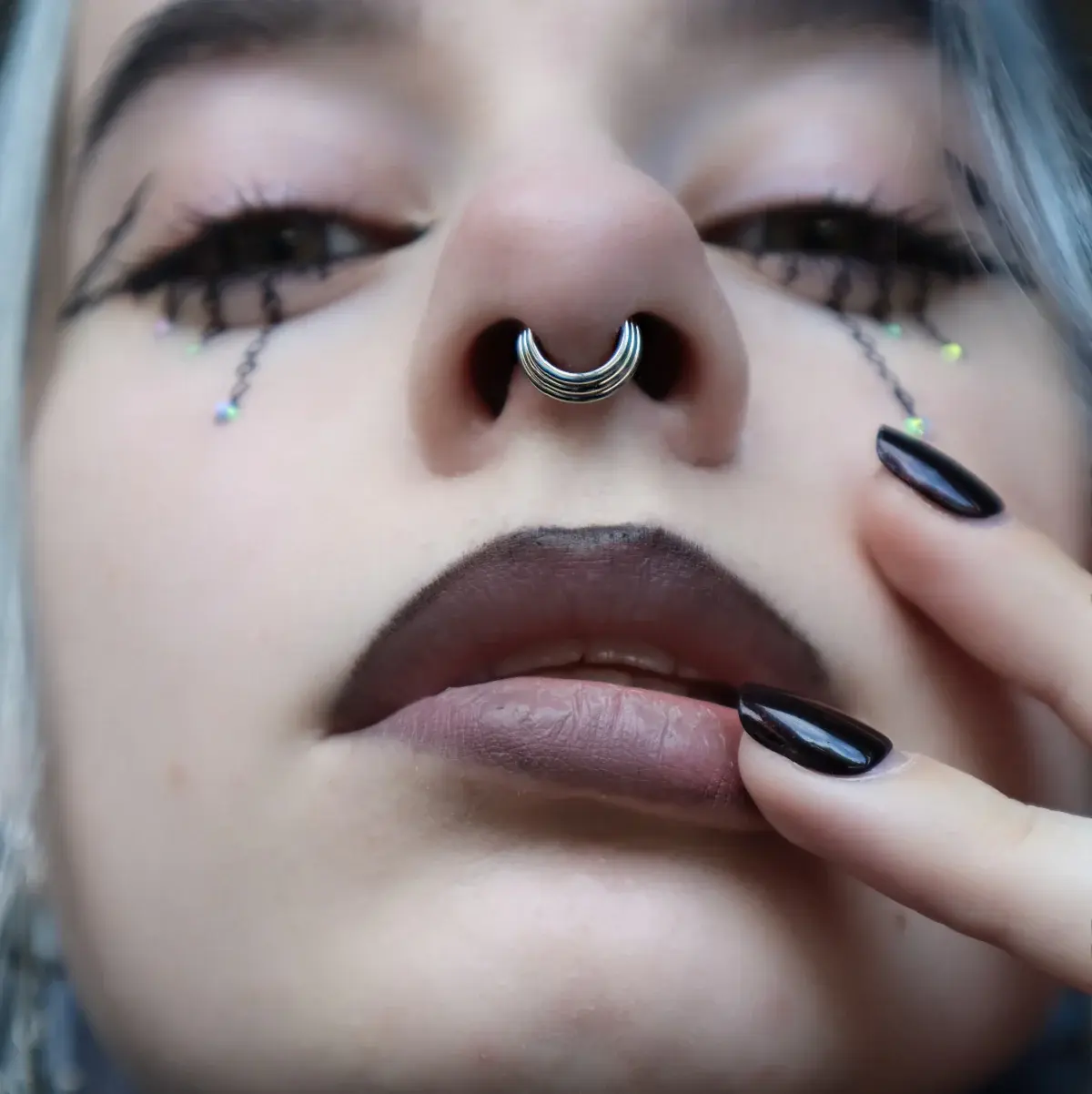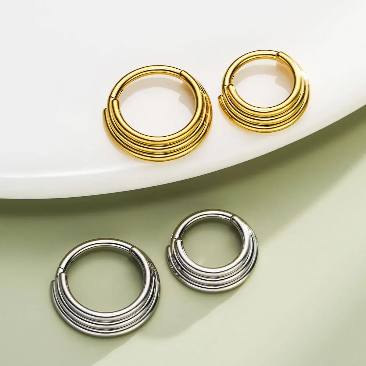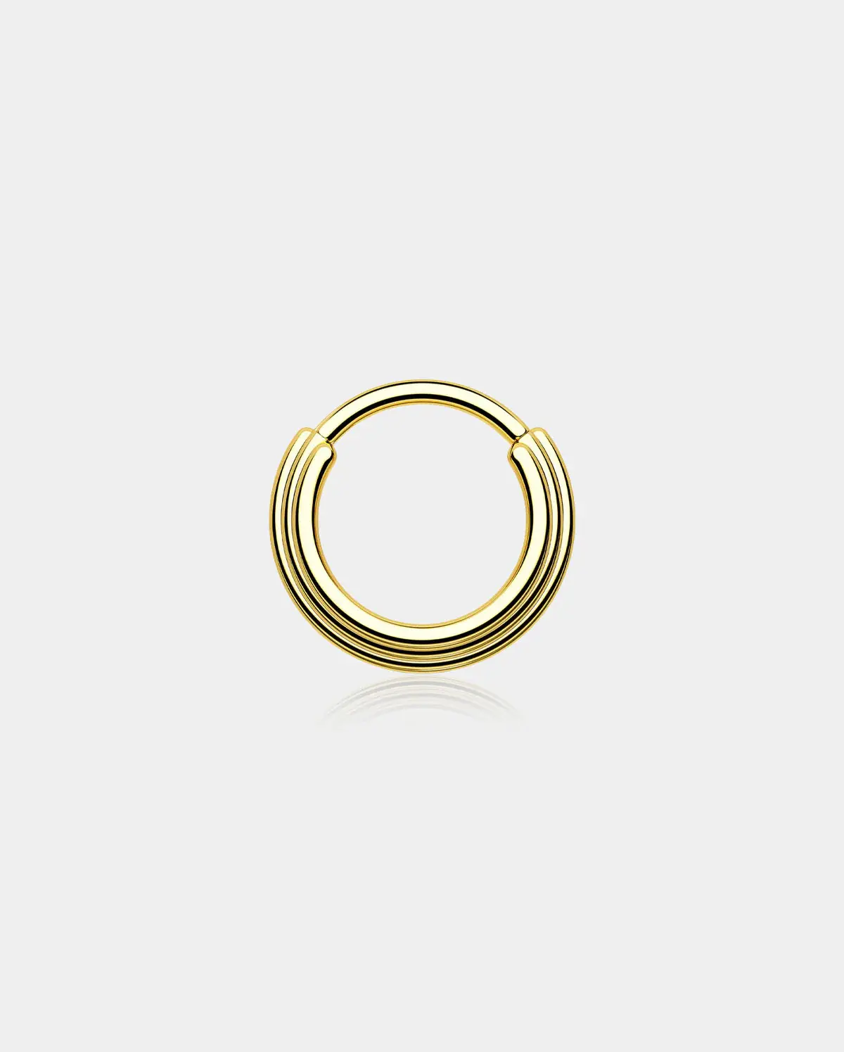This is an exquisite piece of stackedseptum jewelrythat offers a unique and intricate design for those seeking to elevate their style. It features a stunning three-layered circle pattern, each layer adding depth and dimension to the overall look. The concentric circles create a captivating visual effect, drawing attention to the wearer's features with its elegant and artistic design.