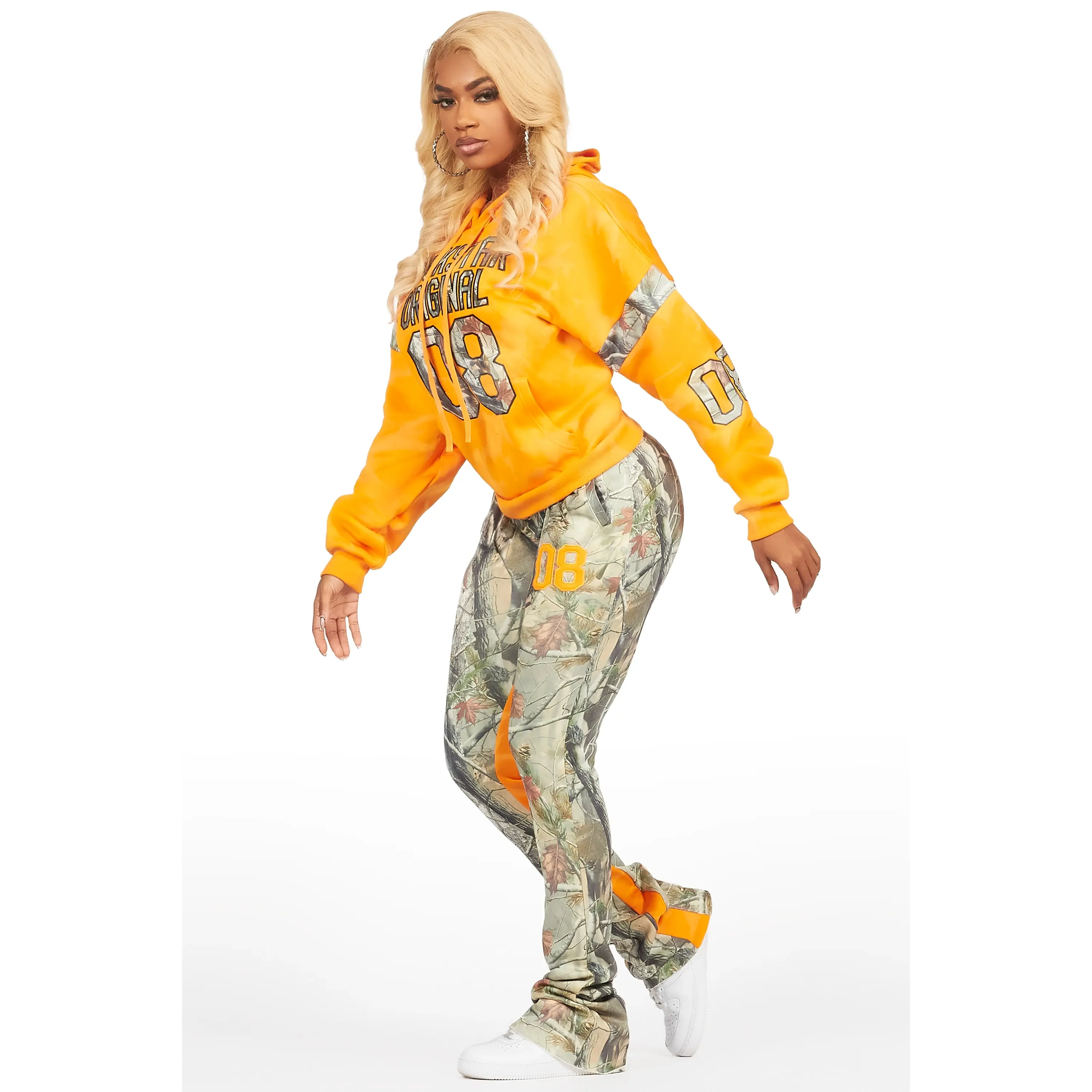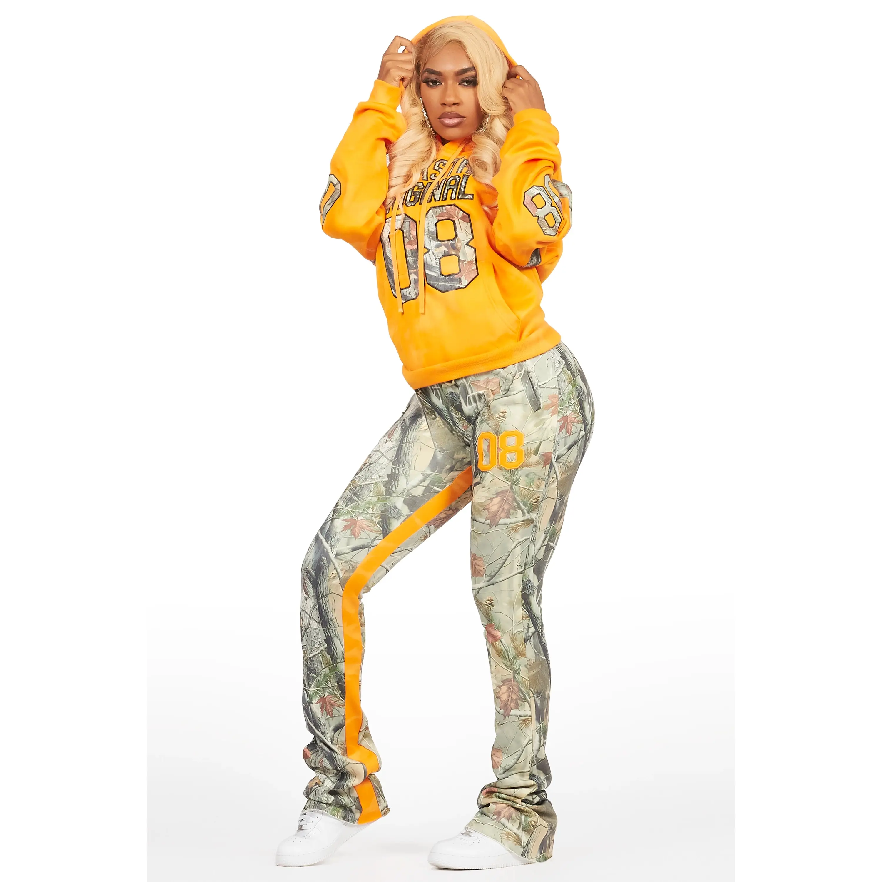 An urban two-piece hoodie and stacked sweat pant set for women in orange. Designed with ultra soft fabric for the perfect everyday tracksuit set.