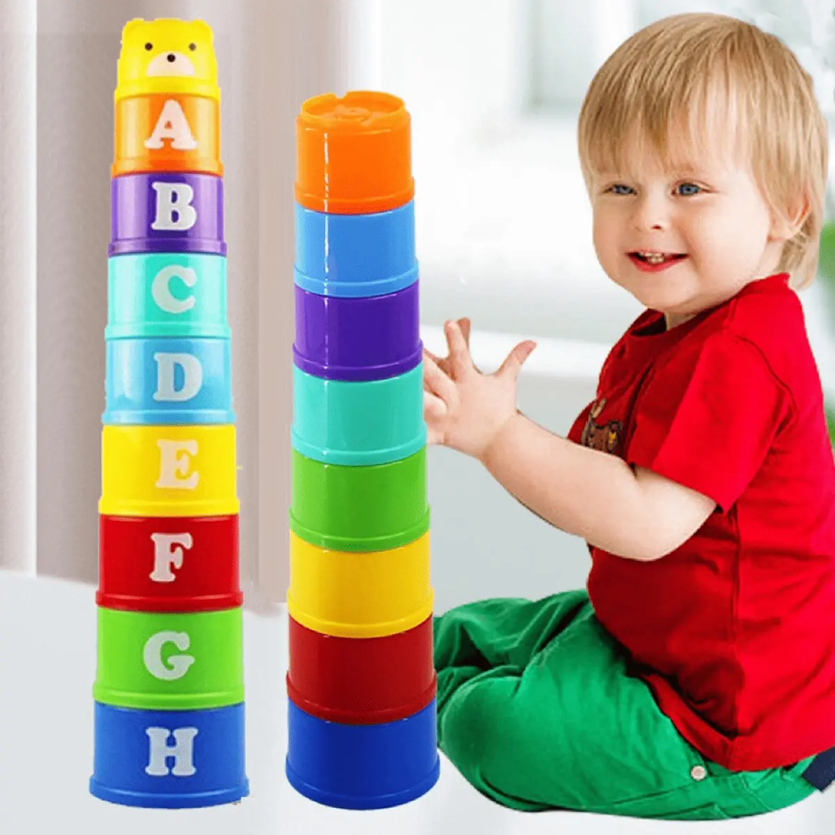 【Colorful Stacking Cups】: These stacking cups feature vibrant colors with random designs, perfect for visual stimulation in young children.