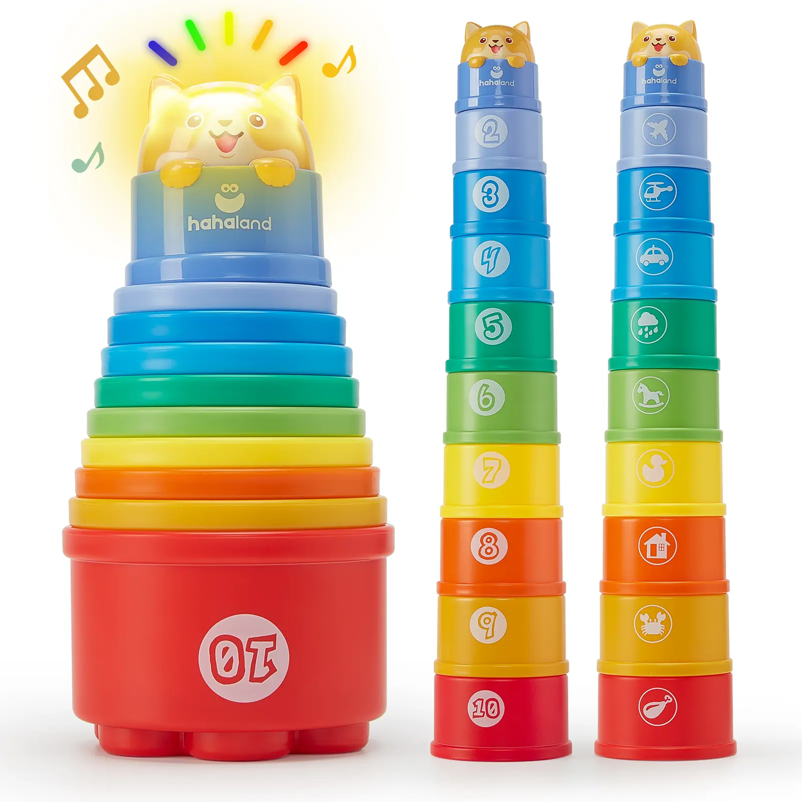 ·10 Pcs Stacking Cups Set with Light and Sound: There are ten colorful, numbered cups that baby can stack them up, knock them down, nest inside each other, splash around, or build a sandcastle – a classic stacking toys set for any playful occasion! There's a cute animal cup that baby can put on top of the whole stack with rewarding sounds and blinking lights! (Battery included) Intended for babies, toddlers and early learners of 6 months to 3 years old\