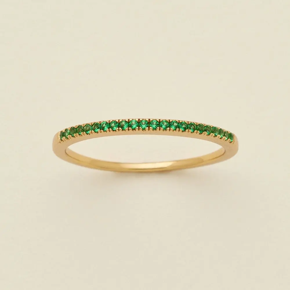 The green of these stones is very bright—keep it in mind if you like a deeper emerald stone. I absolutely adore it because I like to pair it with two other birthstone rings. Very thing band so it stacks extremely well with others.