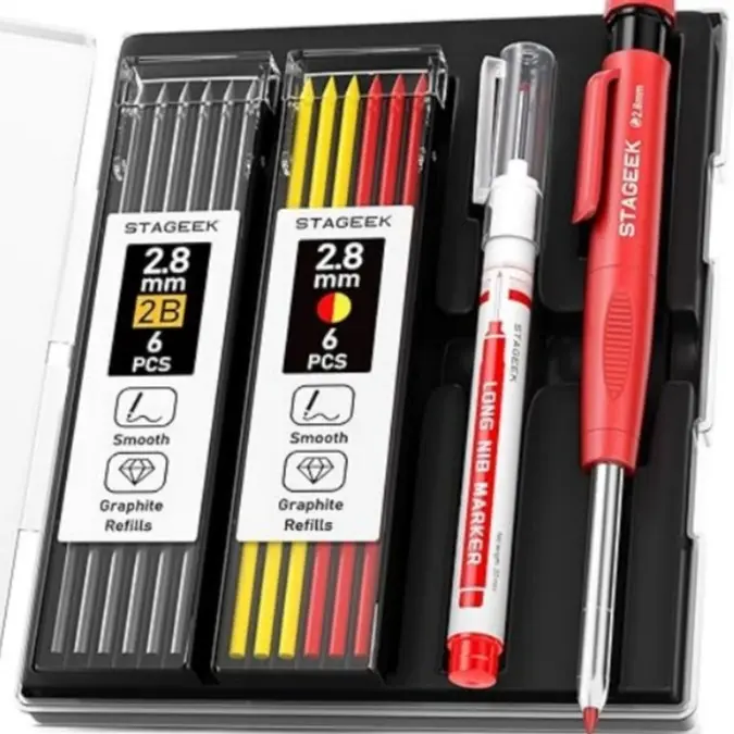 ·Exquisite Carpenter Pencil Set: Include a sturdy carpenter pencil, 13pcs 2.8mm 2B Lead refills in black, red and yellow. Additionally, you'll receive Long Nosed Marker Pen in red ink, along with a plastic storage box for organization and convenience, This comprehensive collection empowers you to tackle tasks with speed and ease.