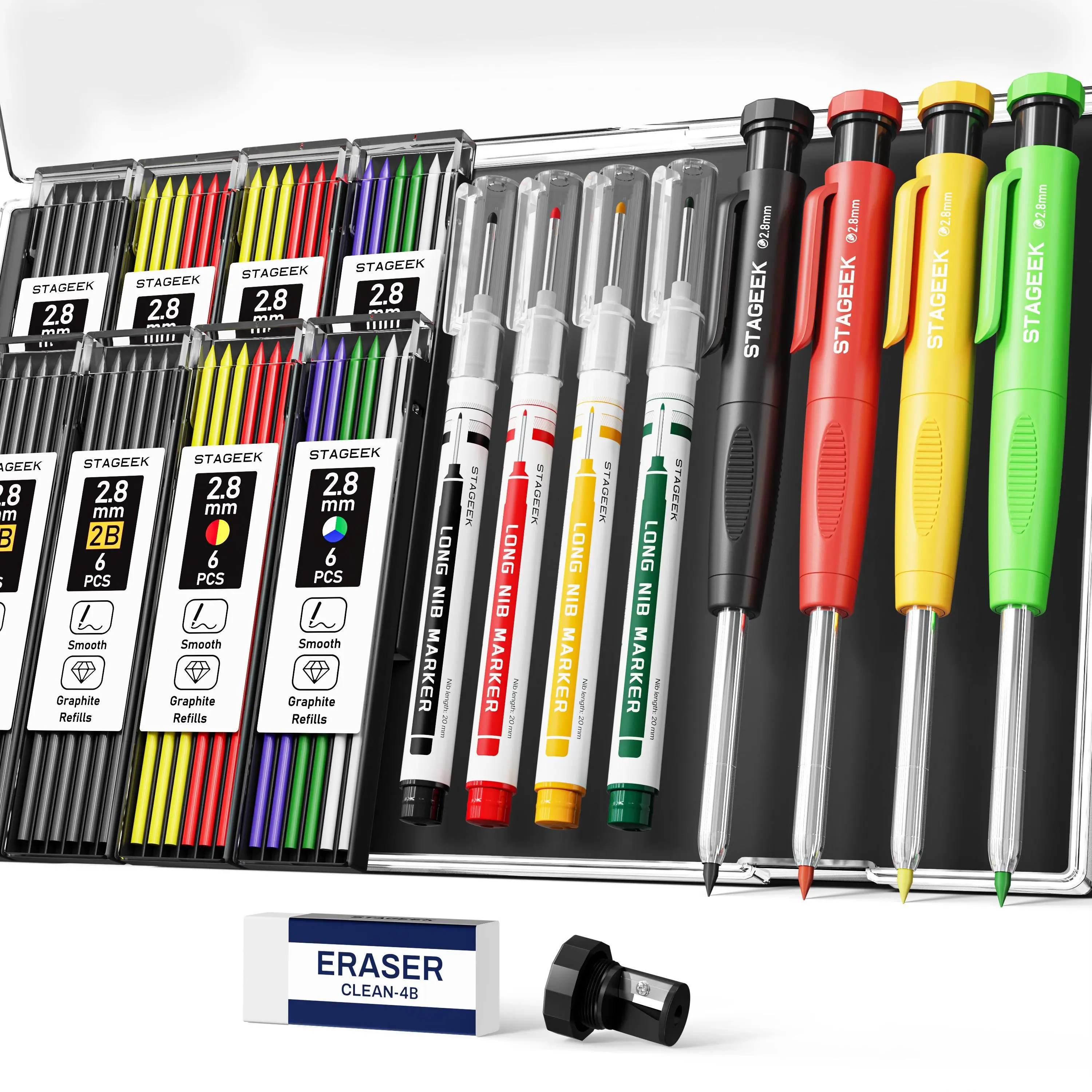5. STAGEEK 4 Pack Carpenter Pencil with Sharpener, Mechanical Carpenter Pencils with 52 Refills, Construction Pencil Heavy Duty Woodworking Pencils for Architect (Red, Black, Yellow, Blue)
