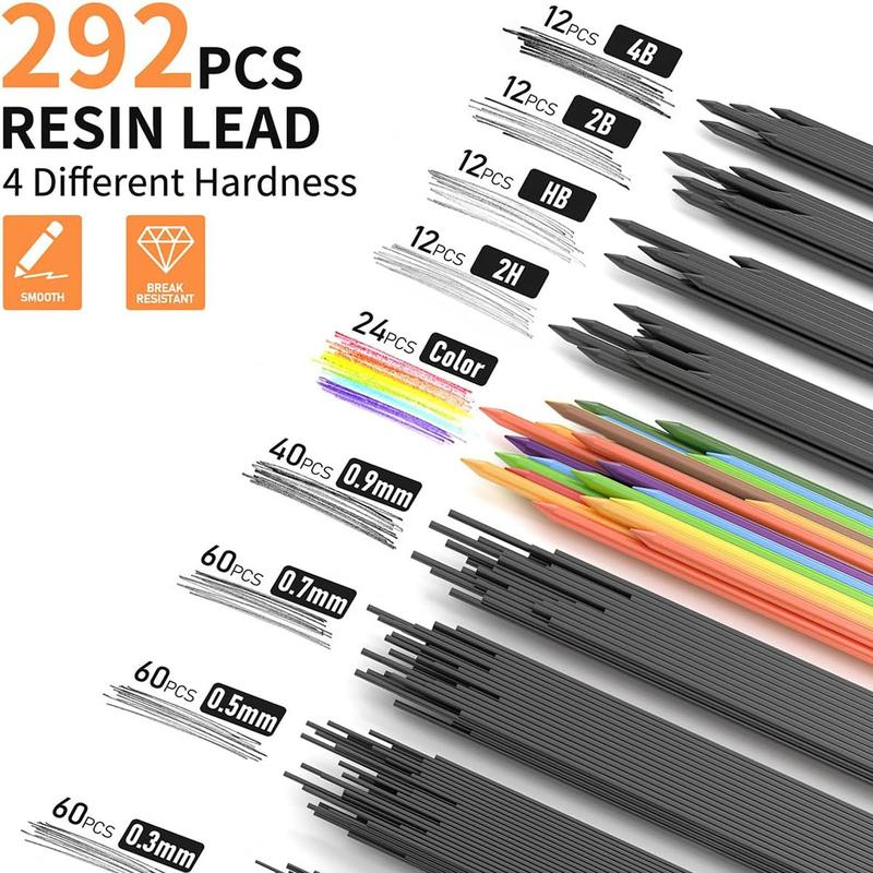 ·Exquisite Artist Set: Includes 5 metal drafting mechanical pencils (0.3, 0.5, 0.7, 0.9, 2.0mm lead holder), 4 tubes of graphite lead refills (0.3, 0.5, 0.7, 0.9mm) pencils #2, 4 tubes of 2.0mm lead (4B, 2B, HB, 2H), 2 tubes of 12 color leads, 2pcs soft 4B erasers, a kneaded eraser, a gum eraser, 2 sharpeners, 9 cap eraser refills, and a plastic case.